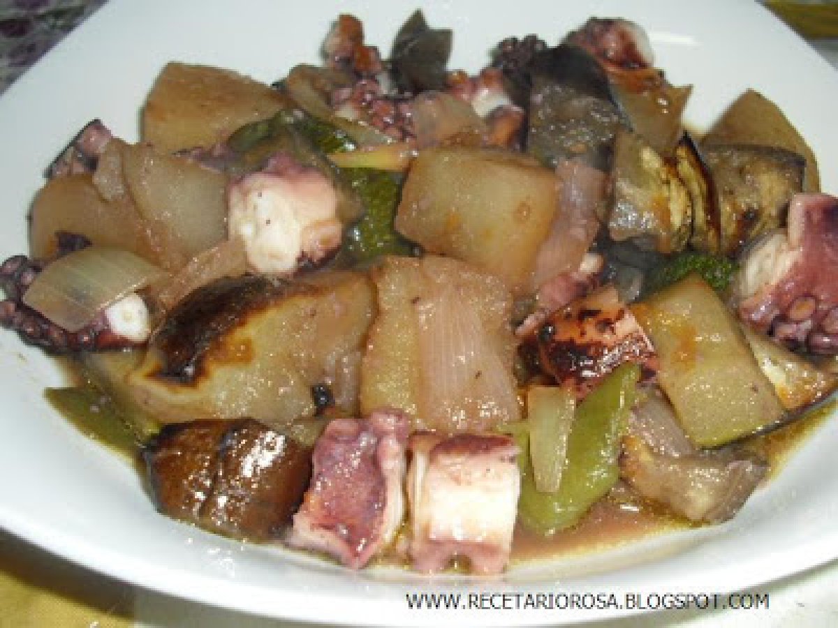 Pulpo al horno con verduras vota ahora AnteriorSiguiente PlatoFácil35 min Enviar esta receta a un amigo Imprimir esta página Preguntar al autor Publicar la foto de esta receta Ingredientes 2 2 pulpos pequeños 1 berenjena 1 calabacín 2 patatas grandes 2 pimientos verdes 2 cebollas Aceite y sal