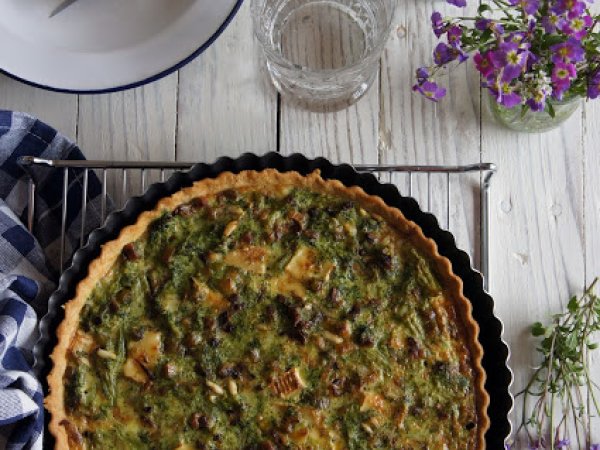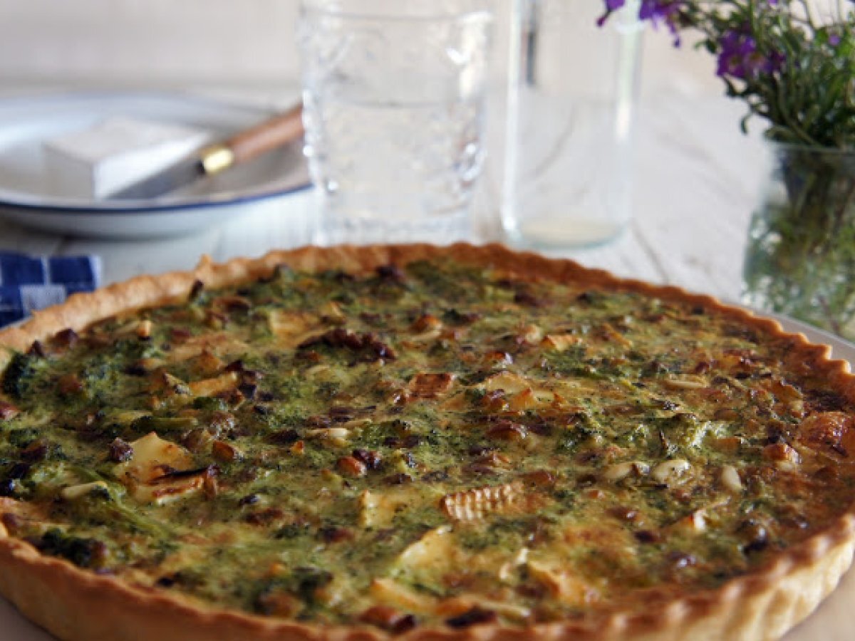 Quiche con brie, ajetes, brócoli y piñones AnteriorSiguiente PlatoFácil45 min1270 Kcal Enviar esta receta a un amigo Imprimir esta página Preguntar al autor Publicar la foto de esta receta Una quiche de lo más sana Ingredientes 2 150 g de harina 50 g de mantequilla 1 huevo 1 cucharadita de sal y otra de azúcar Un manojo de ajetes 300 g de brócoli 75 g de queso Brie 75 g de piñones tostados 1 huevo 200 ml de nata líquida sal y pimienta Costo estimado: 7.78Euros€ (3.89€/porción)
