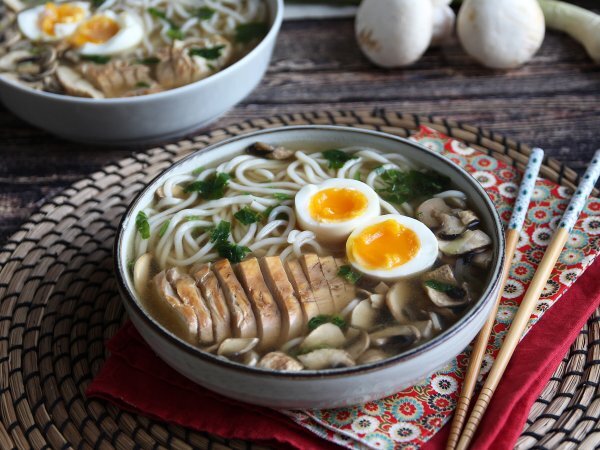 Cuando uno se pregunta por una receta asiática reconfortante ¡piensa inmediatamente en el Ramen! Una sopa nutritiva y saciante que sienta de maravilla en los días de frío. Al caldo le añadiremos unos fideos chinos, pollo, champiñones y también un huevo mollet que aportará un toque irresistible al plato. Para preparar esta receta vamos a usar ingredientes que podemos encontrar fácilmente en el supermercado. Eso sí, tendremos que realizar varias elaboraciones, aunque el resultado bien merece la pena. Es más, con nuestra explicación paso a paso te resultará muy fácil ¡Buen provecho!