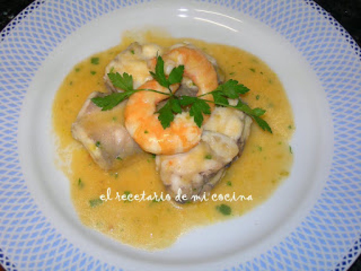 Rape al azafran PlatoFácil55 min457 Kcal Enviar esta receta a un amigo Imprimir esta página Preguntar al autor Publicar la foto de esta receta Ingredientes 4 1 kg de rape 1 pimiento verde 1 cebolleta 1 tomate 2 dientes de ajo 600 ml de caldo pescado con los siguientes 1 puerro 1 zanahoria 1 pastilla de caldo de pescado 8 langostinos Harina de maíz Azafrán Aceite de oliva Sal Perejil