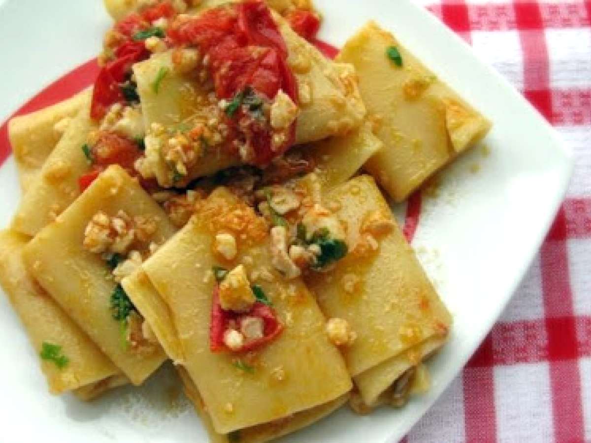 Pasta con pescado AnteriorSiguiente PlatoFácil30 min469 Kcal Enviar esta receta a un amigo Imprimir esta página Preguntar al autor Publicar la foto de esta receta Ingredientes 2 2 filestes de pescado blanco 300 g de tomatitos cherry/tomatitos cerezas 200 g de pastas paccheri 1 diente de ajo 1/2 de vino blanco aceite de oliva sal y pimienta a gusto Costo estimado: 3.27Euros€ (1.63€/porción)