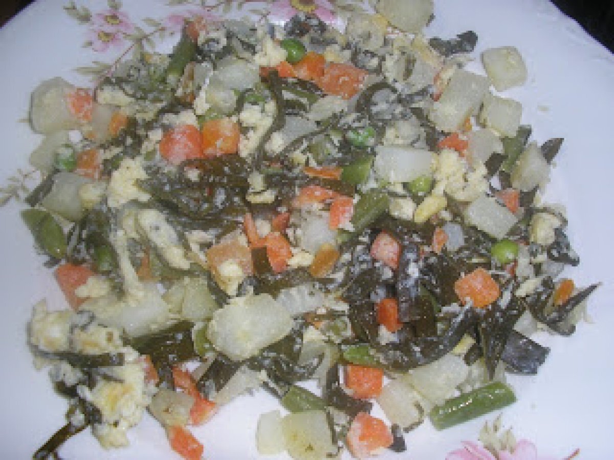 Revuelto de verdura con espaguetis del mar vota ahora PlatoFácil1 h 15 m Enviar esta receta a un amigo Imprimir esta página Preguntar al autor Publicar la foto de esta receta Ingredientes 4 500 g de ensaladilla congelada marca hacendado 750 g de agua para el vaso sal 1 lata de maíz sal 1 huevocebolla 2 huevos aceite Espagueti de Mar con ajetes en conserva