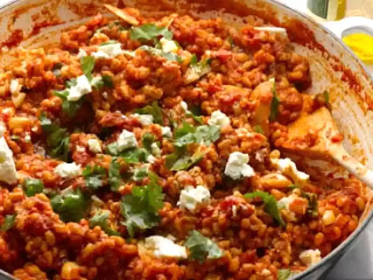 Risoto de cebada con tomate y queso feta PlatoFácil45 min Enviar esta receta a un amigo Imprimir esta página Preguntar al autor Publicar la foto de esta receta Ingredientes 4 3 cucharadas de aceite de oliva además de un chorrito extra al final 4 dientes de ajo picados fino clavo 750 g de tomates frescos pelados sin pepitas y picados ½ cucharadita de pimentón dulce 1 cucharada de tomillo 4 tiras de cáscara de limón 1 ½ cucharadita de azúcar sal 270 g de cebada perlada aclarada con agua fría y escurrida 200 ml de caldo de verduras 20 g de cilantro picado un poco más para adornar pimienta negra 200 g de queso feta