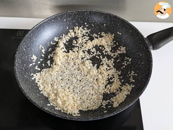 Pica finamente la cebolla y sofríela en una sartén con un poco de mantequilla. Después, añade el arroz y tuéstalo durante unos minutos, removiendo con frecuencia.