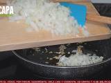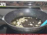 La cortamos en trocitos pequeños, más o menos como estos y la añadimos a la sartén junto con el ajo, le ponemos una pizca de sal para que la cebolla se poche antes y dejamos que se vaya pochando a fuego medio.