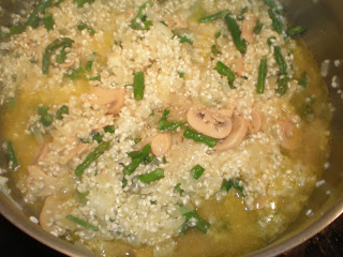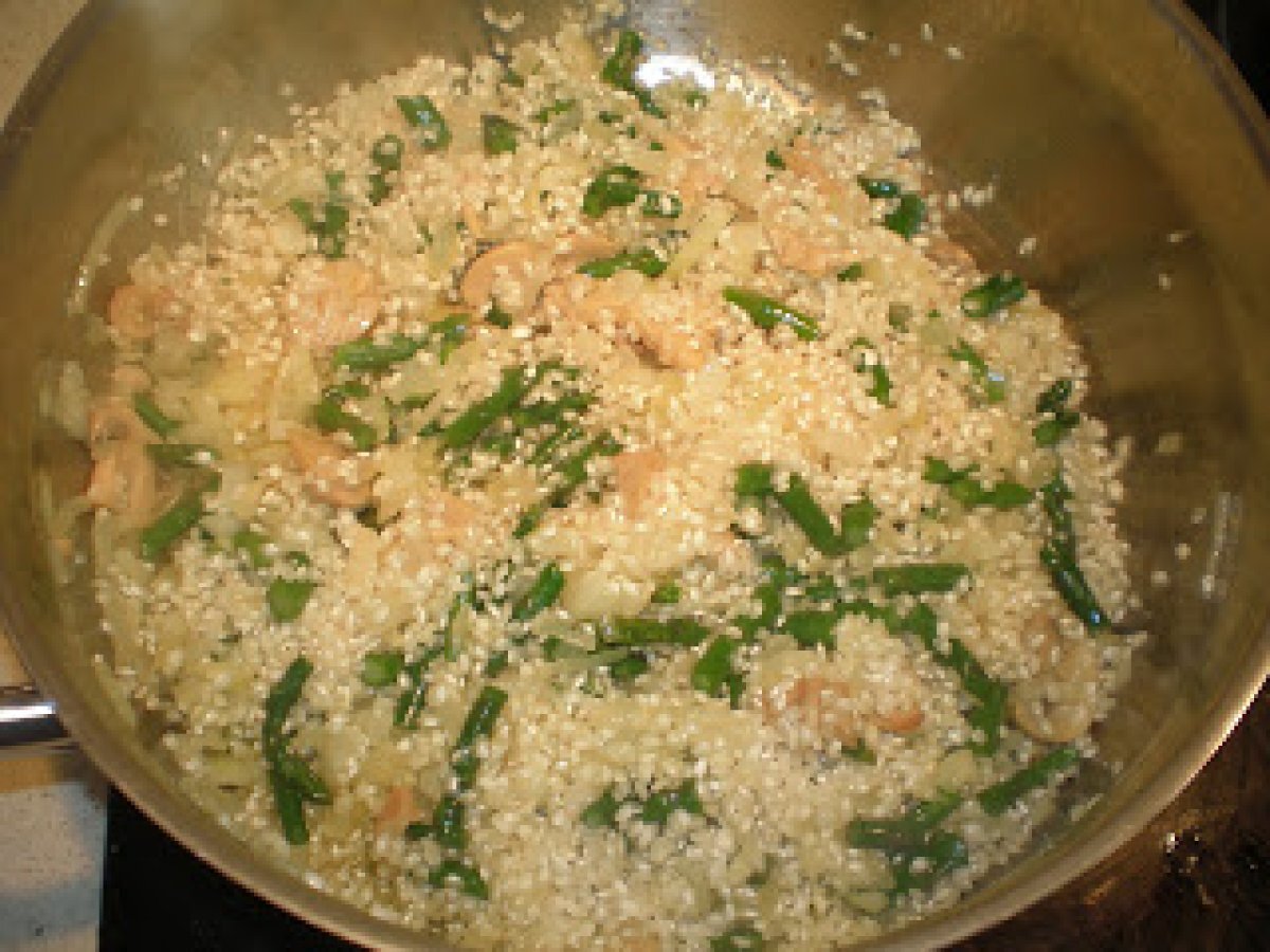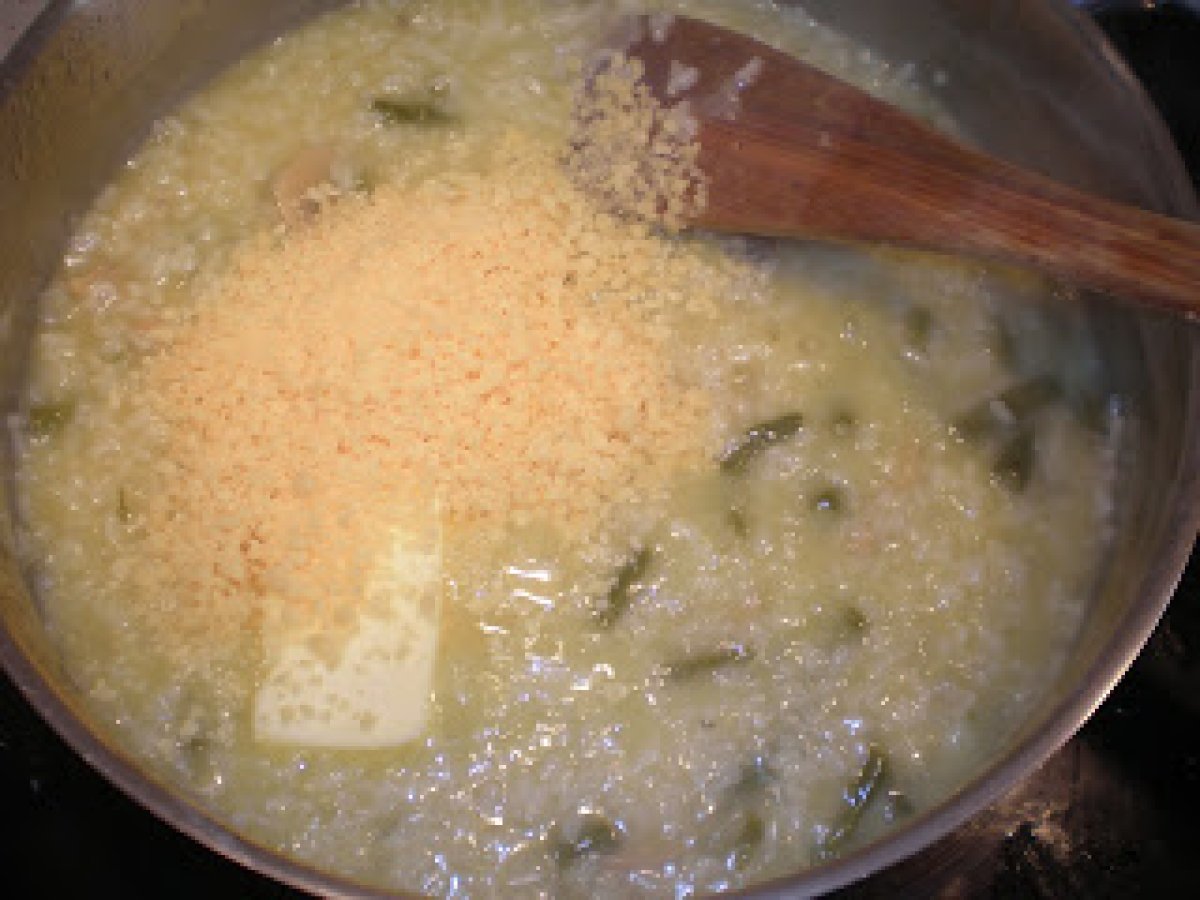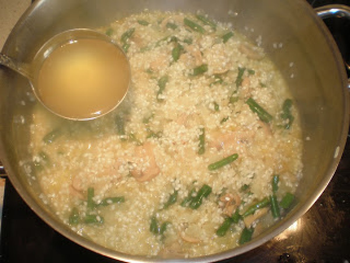 Rissotto de espárragos y champiñones AnteriorSiguiente PlatoFácil35 min685 Kcal Enviar esta receta a un amigo Imprimir esta página Preguntar al autor Publicar la foto de esta receta Ingredientes 4 400 g arroz 150 g espárragos trigueros 150 g champiñones laminados 1 cebolla 1 vaso de vino blanco 1 l.caldo de pollo 60 g mantequilla 150 g de queso (parmesano o manchego curado), aceite sal.