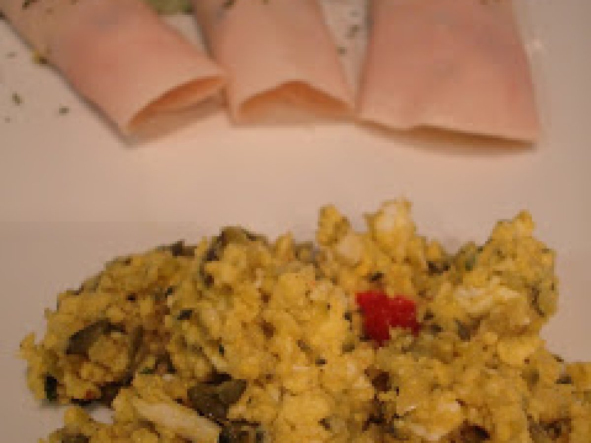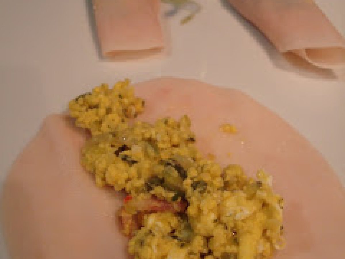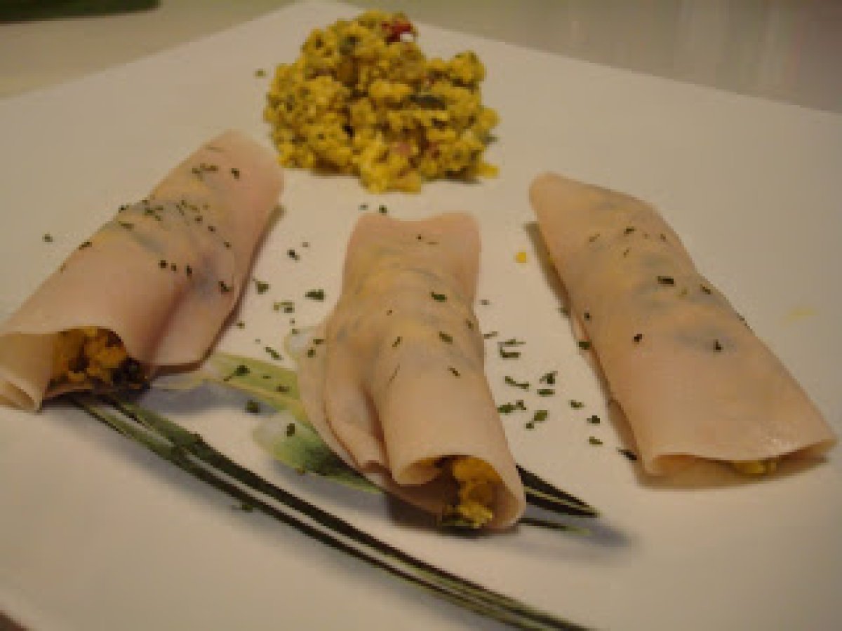 Rollitos de pavo rellenos de verduritas y havarti AnteriorSiguiente PlatoFácil20 min Enviar esta receta a un amigo Imprimir esta página Preguntar al autor Publicar la foto de esta receta Ingredientes 1 2 ajos 1 calabacín pequeño ½ bote de pimientos asados en tiras 3 lonchas de queso havarti Sal y perejil 4 huevos Lonchas de pavo