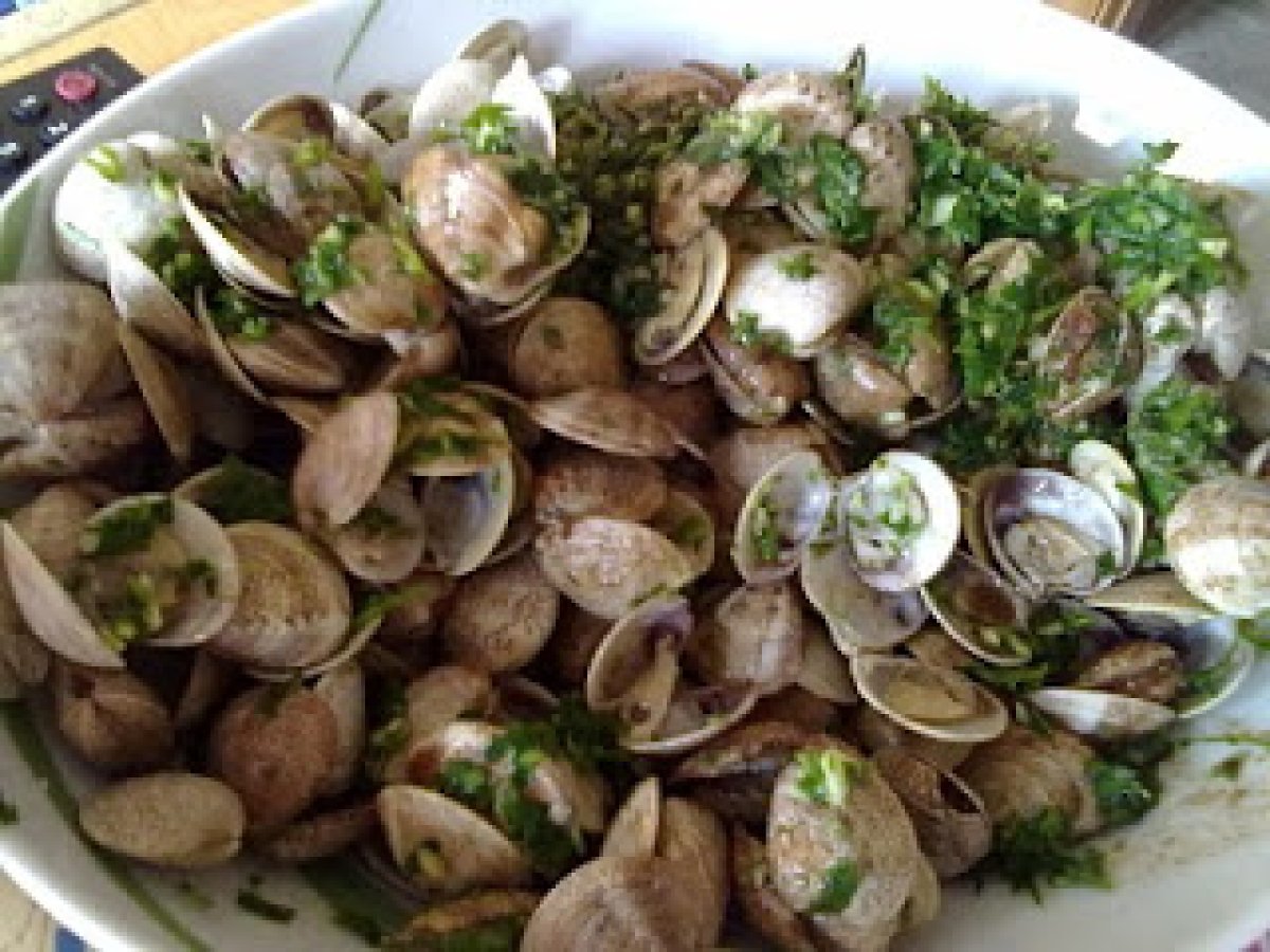 - Picamos ajo y perejil,ponemos la rossellona en una fuente, y echamos por encima el ajo y perejil,calentamos aceite,y se lo echamos por encima. Y a cojer pan,y a disfrutar!!!