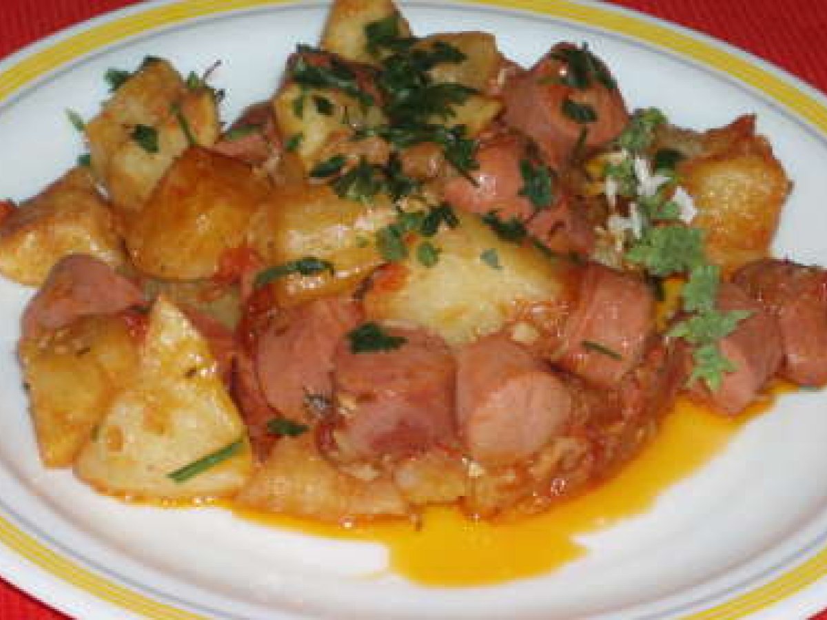 Salchichas de pollo con papas PlatoMedio45 min239 Kcal Enviar esta receta a un amigo Imprimir esta página Preguntar al autor Publicar la foto de esta receta Ingredientes 8 2 paquetes de salchichas de pollo 1 kg. de papas 1 puerro 1 cebolla 4 dientes de ajo (grandes) 100ml. de tomate frito 1 copita de vino blanco 1 cucharita (de café) de orégano pimentón dulce ( una cucharita de café) Perejil sal y pimienta aceite de oliva Costo estimado: 5.51Euros€ (0.69€/porción)
