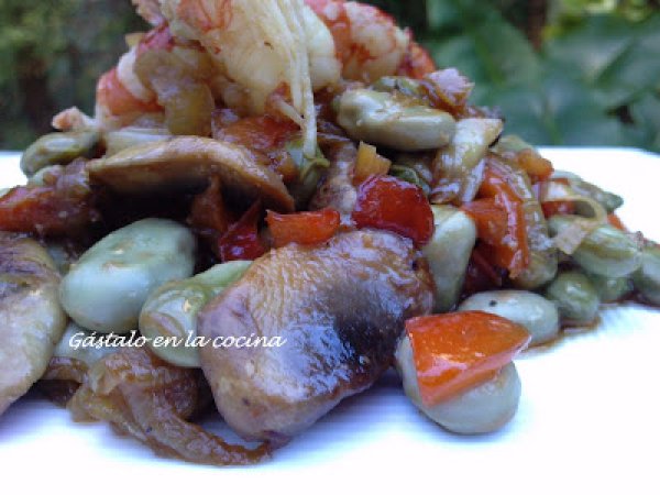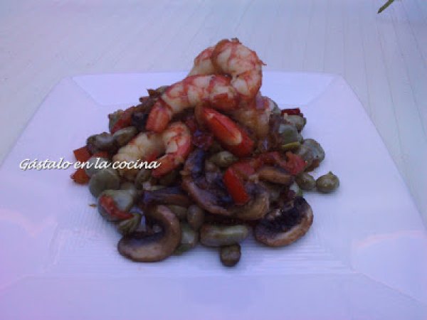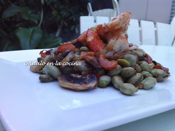 Salteado de habas y gambas AnteriorSiguiente PlatoFácil20 min Enviar esta receta a un amigo Imprimir esta página Preguntar al autor Publicar la foto de esta receta Ingredientes 2 Medio pimiento rojo Media cebolla mediana 1 puerro pequeño 4 champiñones 12 gambones (si son gambas o langostinos poned algunos más porque estos son grandes) Sal Pimienta Ajo en polvo (también vale del normal) 3 cucharadas de aceite