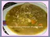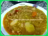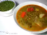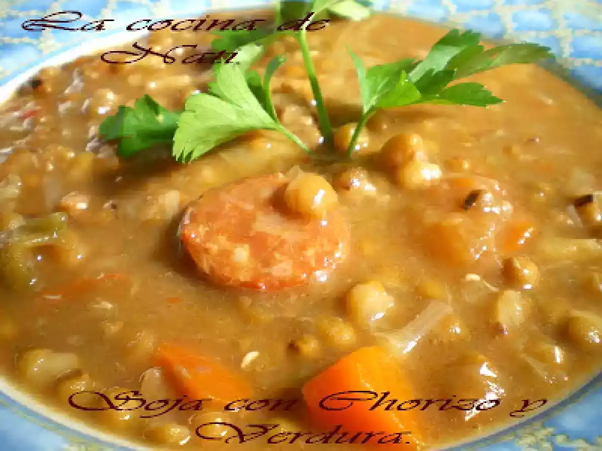 Soja con chorizo y verduras. AnteriorSiguiente PlatoFácil1 hora1115 Kcal Enviar esta receta a un amigo Imprimir esta página Preguntar al autor Publicar la foto de esta receta Ingredientes 2 300 g. de soja verde. 1 cebolla. 1 diente de ajo. 2 zanahoria. 150 g. de chorizo. 1 tomate. 1 pimiento verde. 4 cucharadas de aceite. 1 pastilla de caldo casero. Costo estimado: 17.31Euros€ (8.66€/porción)