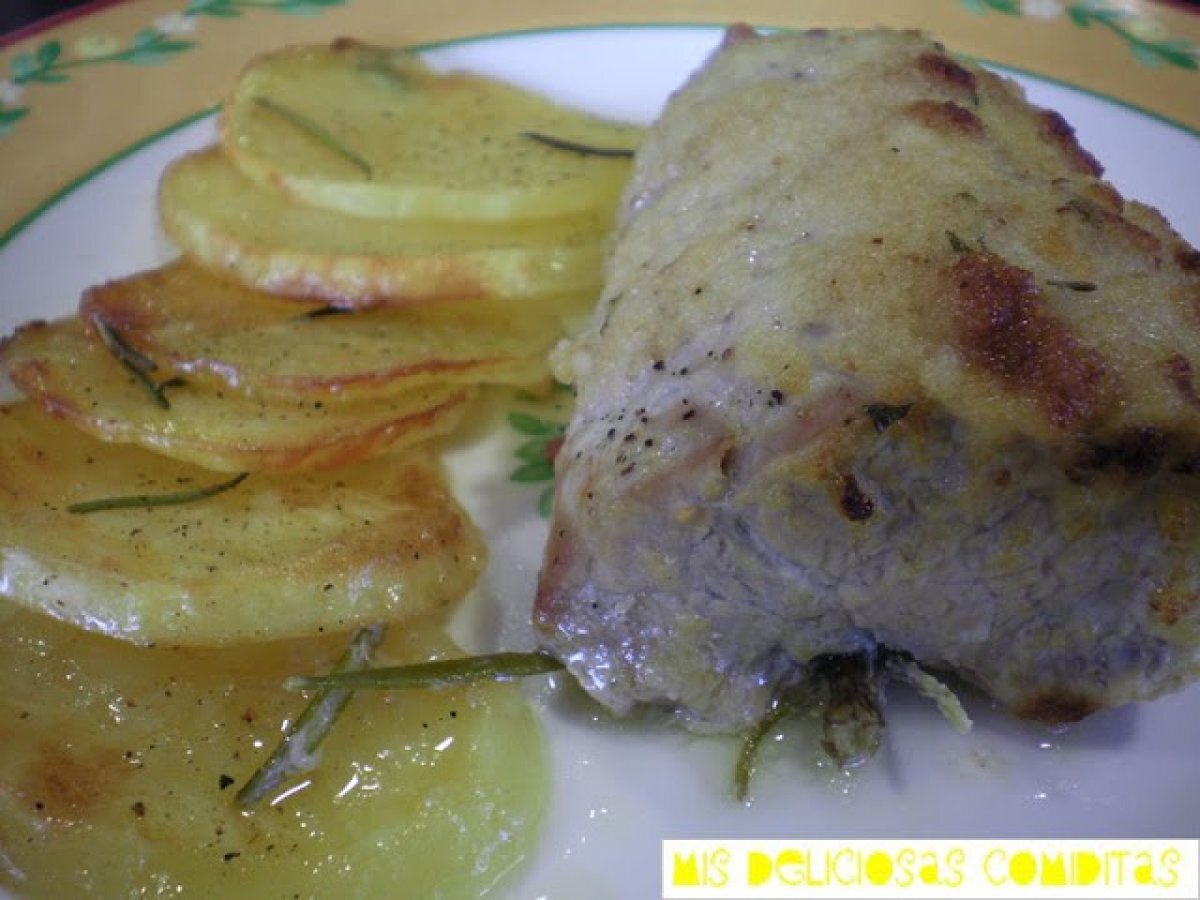 Solomillo de cerdo al horno PlatoMedio1 h 5 m117 Kcal Enviar esta receta a un amigo Imprimir esta página Preguntar al autor Publicar la foto de esta receta Ingredientes 8 1 solomillo de cerdo sal pimienta mantequilla aceite de oliva pan rallado zumo de limón Unas ramas de romero 2 patatas Costo estimado: 3.37Euros€ (0.42€/porción)