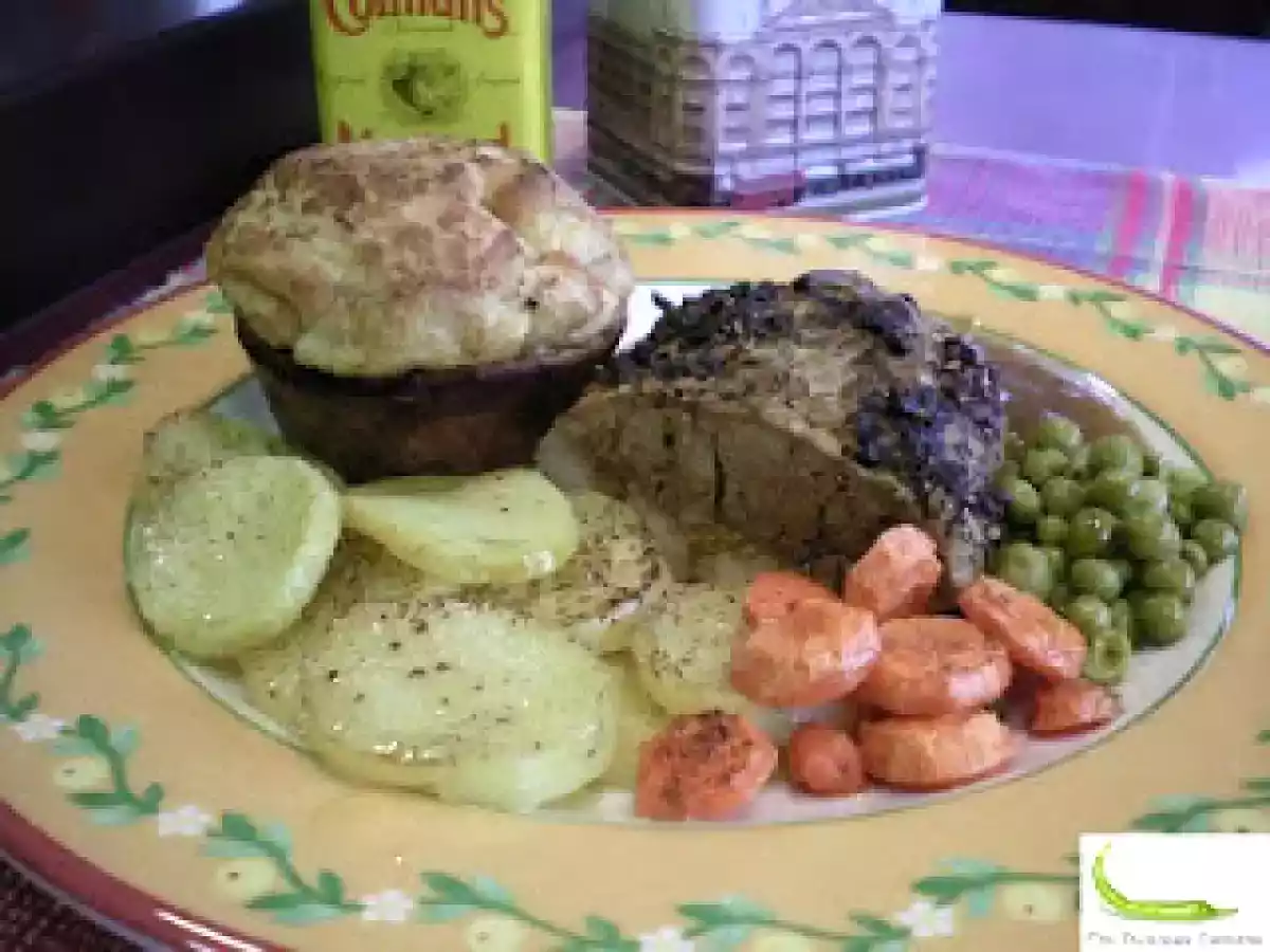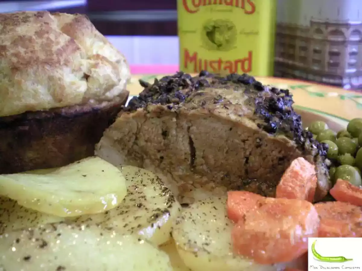 Solomillo de cerdo en costra de pimienta y mostaza AnteriorSiguiente PlatoFácil1 hora915 Kcal Enviar esta receta a un amigo Imprimir esta página Preguntar al autor Publicar la foto de esta receta Ingredientes 2 Un solomillo de cerdo Dos cucharadas de mostaza inglesa Dos cucharadas de pimienta negra en grano Zumo de un limón Aceite de oliva Sal 1/2 vaso de vino blanco Una taza de caldo de carne una cucharada de maizena Dos patatas Dos zanahorias 100 g de guisantes verdes Un huevo 1/2 taza de harina 1/2 taza de leche Una pizca de sal Jugo de la cocción de la carne Mantequilla Costo estimado: 6.53Euros€ (3.27€/porción)