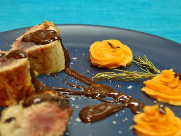 Solomillo de cerdo ibérico con boniato y chocolate