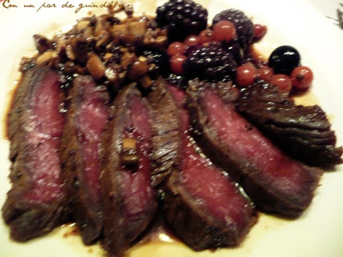 Solomillo de ternera y frutos rojos macerado en soja AnteriorSiguiente PlatoFácil30 min178 Kcal Enviar esta receta a un amigo Imprimir esta página Preguntar al autor Publicar la foto de esta receta Ingredientes 2 Solomillo de ternera ("tournedo"). Champiñones. Frutos rojos (arándanos, moras y frambuesas). Para el marinado: Soja. Mostaza a la antigua. Pedro Ximénez. Una cucharada de miel. Costo estimado: 3.79Euros€ (1.9€/porción)