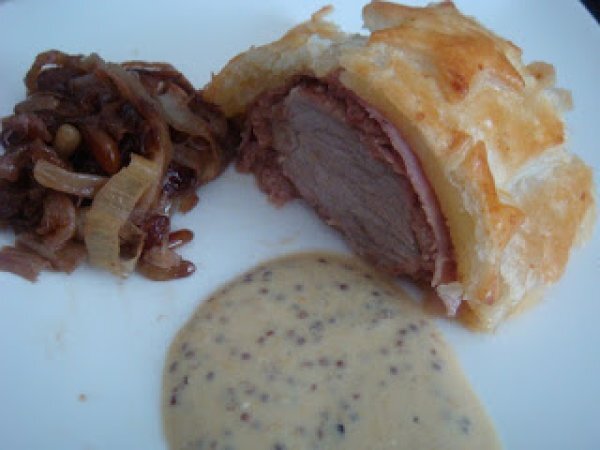 Solomillo wellington AnteriorSiguiente PlatoFácil1 hora Enviar esta receta a un amigo Imprimir esta página Preguntar al autor Publicar la foto de esta receta Aquí es una receta perfecta para los días festivos. Ingredientes 4 2 Solomillos de Cerdo ó 1,5 kg de Solomillo de Ternera 2 planchas de Hojaldre 4 lonchas de Jamón Cocido Foie Gras 1 Huevo Aceite de Oliva 3 Cebollas 50 g de Pasas Sultanas 50 g de Piñones 50 g de Nueces ½ vasito de Vino Blanco Sal Pimienta Mantequilla 4 cucharadas de Mostaza Antigua 300 ml. de Nata Líquida ½ vasito de Vino Blanco