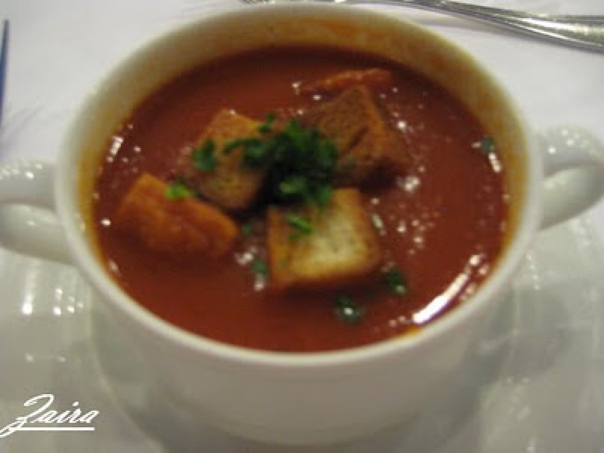 Sopa-crema de tomate, deliciosa para estos días de frío AnteriorSiguiente PlatoMedio35 min Enviar esta receta a un amigo Imprimir esta página Preguntar al autor Publicar la foto de esta receta Ingredientes 6 1 litro y 1/2 de caldo o fondo oscuro hecho en casa 1 kilo de tomates bien maduros 1 cebolla grande 2 patatas 2 zanahorias 1 cucharadita de azúcar aceite de oliva un poco de orégano picado una pizca de cominos molidos una pizca de clavo molido sal y pimienta unos costrones de pan frito y perejil picado para el final