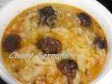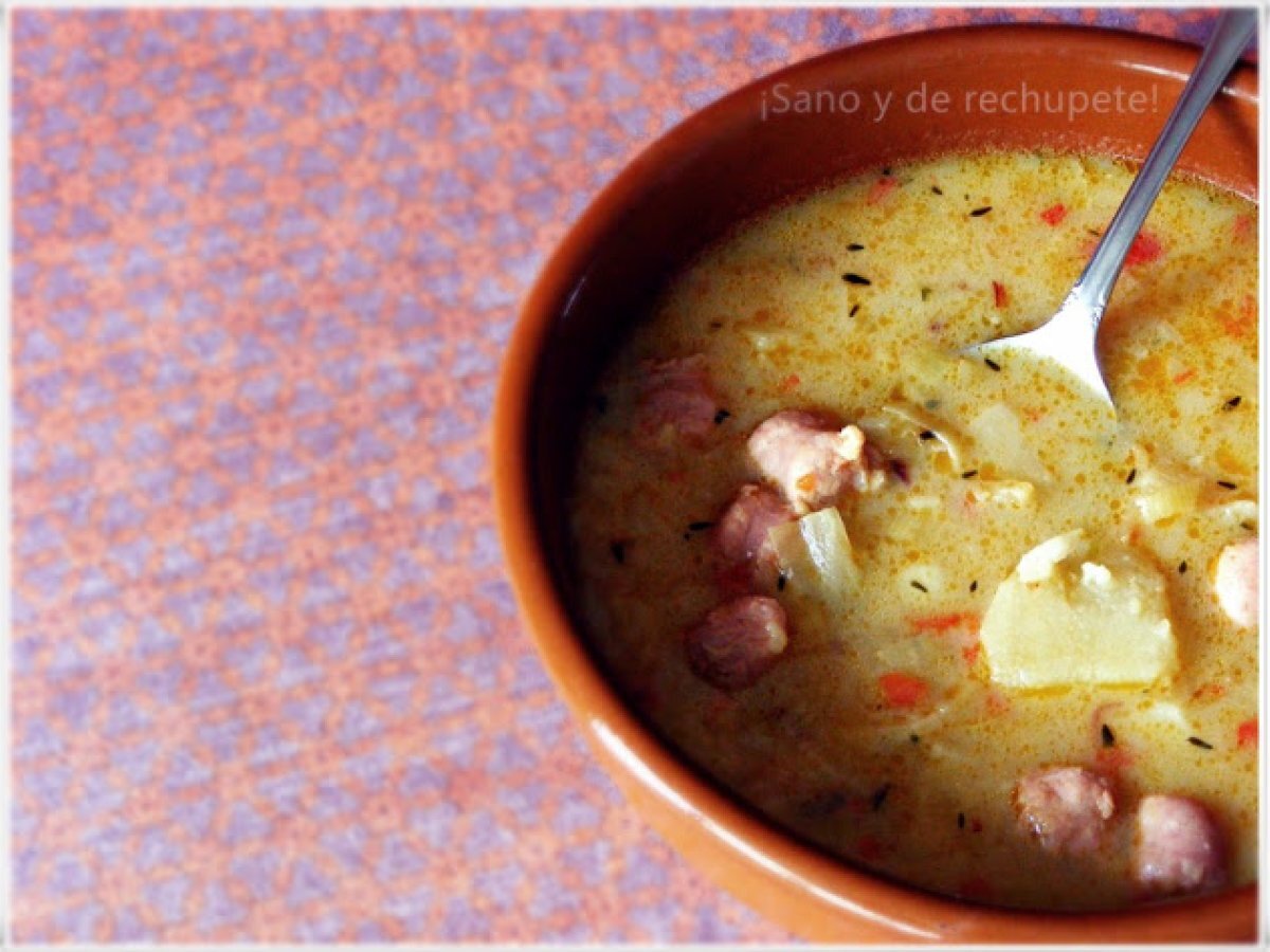 Sopa cremosa de col, papas y albondiguillas de salchichas frescas AnteriorSiguiente PlatoFácil1 h 10 m456 Kcal Enviar esta receta a un amigo Imprimir esta página Preguntar al autor Publicar la foto de esta receta Ingredientes 6 1/4 de col blanca cortada en juliana 1 puerro cortado en rodajas 2 papas grandes 6 salchichas frescas de pavo groseramente cortadas 2 dientes de ajo majados 1/4 de pimiento rojo picado en brunoise la pulpa de un pimiento choricero sal pimienta negra recién molida cúrcuma 2 ramitas de tomillo fresco 2 cucharadas de aceite de oliva virgen extra 400 ml de caldo de verduras 200 ml de leche de soja Costo estimado: 9.23Euros€ (1.54€/porción)