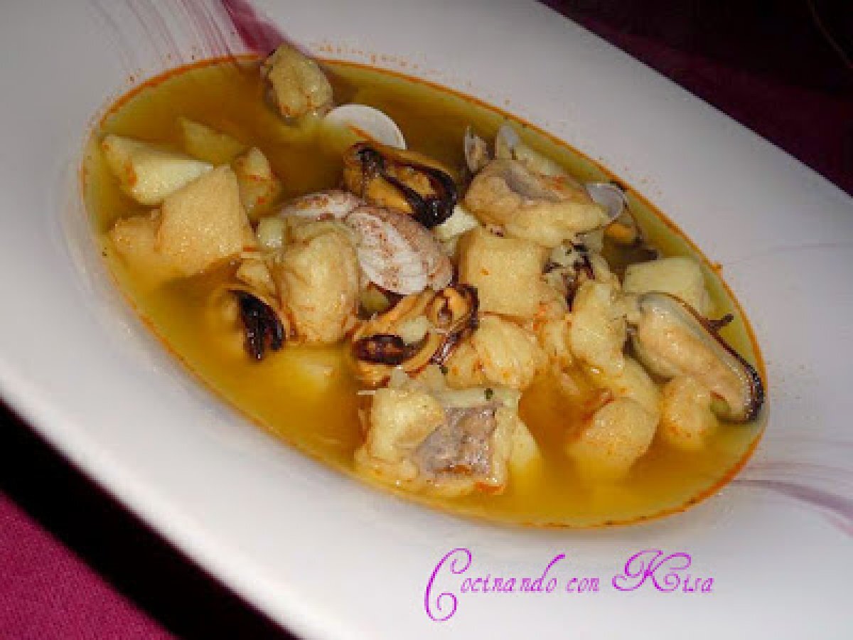 Sopa de marisco y pescado (fussioncook) vota ahora PlatoMedio40 min Enviar esta receta a un amigo Imprimir esta página Preguntar al autor Publicar la foto de esta receta Ingredientes 4 200 grs de gambas 200 grs de chirlas 150 grs de rabas o anillas de calamar 350 grs de rape (1 cola de rape congelada) 200 grs de filetes de merluza 250 grs de mejillones sin cascara congelados 2 cucharadas soperas de tomate frito 3 dientes de ajo ½ cebolla Aceite hasta la mitad de la marca 40 del vaso medidor 2 y ½ litros de agua Colorante Sal