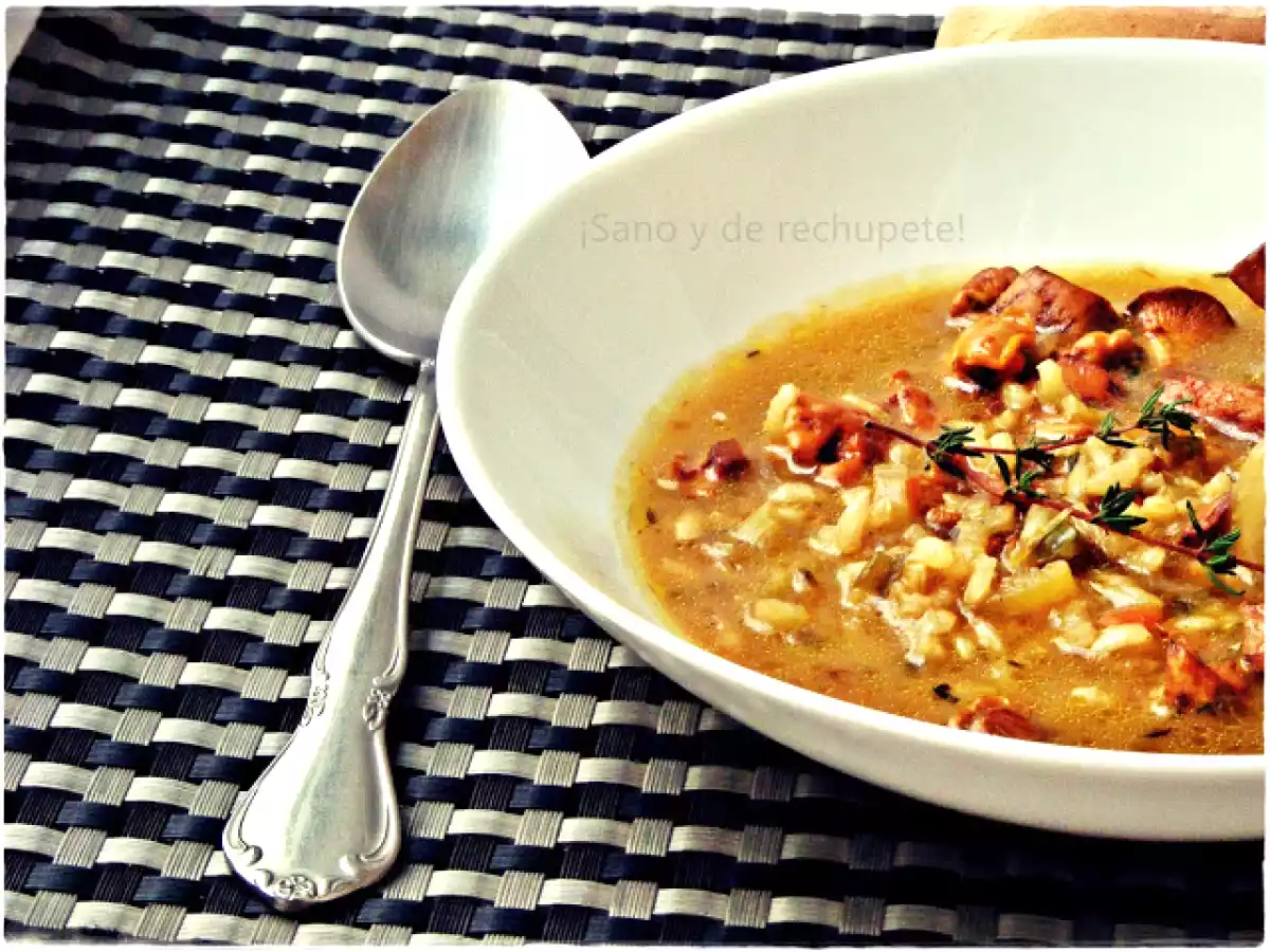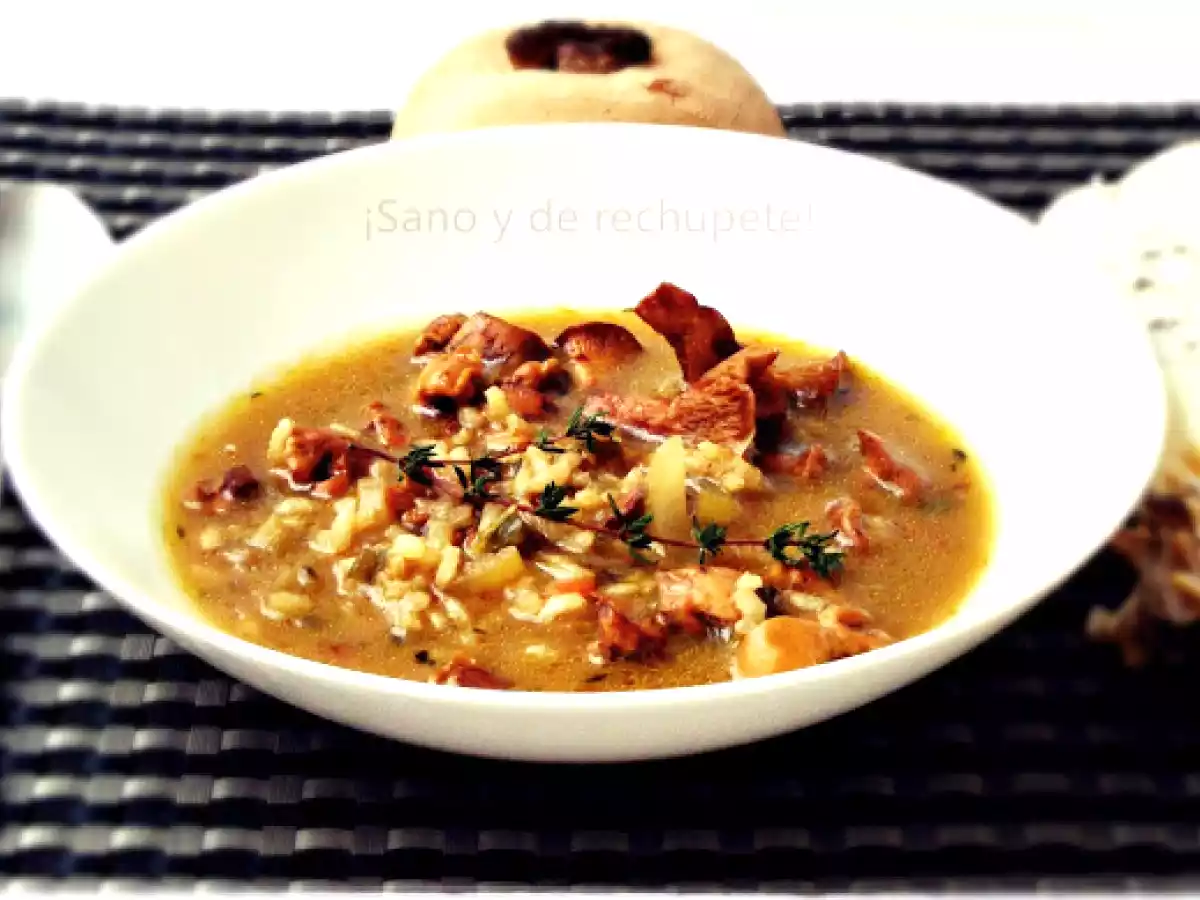 Sopa de setas y arroz integral con tomillo AnteriorSiguiente PlatoFácil45 min198 Kcal Enviar esta receta a un amigo Imprimir esta página Preguntar al autor Publicar la foto de esta receta Ingredientes 2 3/4 l de caldo caliente de verduras y pollo 150 g de setas 3/4 de un vaso de arroz integral ecológico 1 cebolla pequeña finamente picada 2 pencas de apio cortado en ruedecitas 1 trocito de pimiento verde muy picadito 2 dientes de ajo majados 3-4 ramitas de tomillo fresco sal marina pimienta negra recién molida 1 cucharadita rasa de cúrcuma 1 cucharada de aceite aromatizado con tomillo Costo estimado: 2.91Euros€ (1.46€/porción)