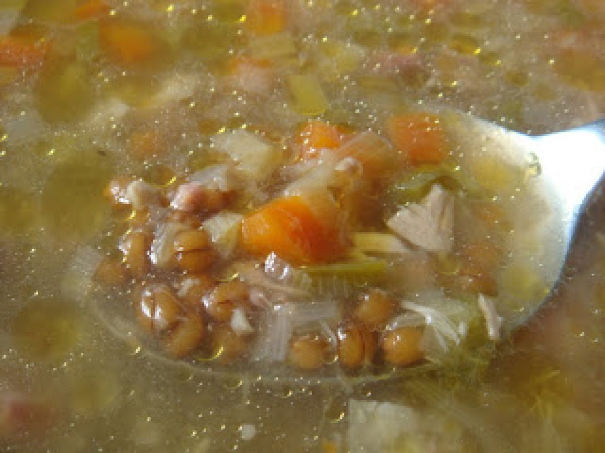 Sopa de trigo y pollo AnteriorSiguiente PlatoFácil1 h 15 m585 Kcal Enviar esta receta a un amigo Imprimir esta página Preguntar al autor Publicar la foto de esta receta Ingredientes 2 100 g de Trigo 2 muslos de Pollo 1 Puerro 1 Zanahoria 1 Pimiento Verde 2 dientes de Ajo 1 Hueso de jamón 2 lonchas de Jamón Agua Aceite de Oliva Sal Perejil