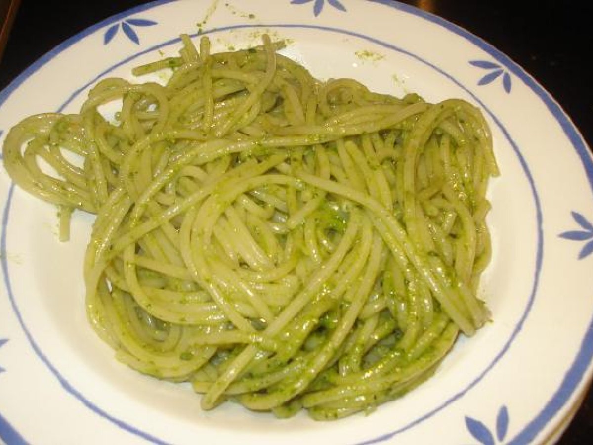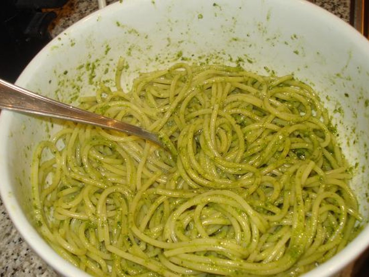 Spaghetti con pesto (espaguetis con salsa pesto) AnteriorSiguiente PlatoFácil20 min1438 Kcal Enviar esta receta a un amigo Imprimir esta página Preguntar al autor Publicar la foto de esta receta Dar del sabor a su ingreso de cocina. Ingredientes 1 220 g de espaguetis Para la salsa pesto: 20 hojas de albahaca, 40 g de piñones, 40 g de parmesano rallado, 40 g de queso de oveja curado (pecorino), 1 diente de ajo, sal y aceite. Costo estimado: 9.34Euros€ (9.34€/porción)