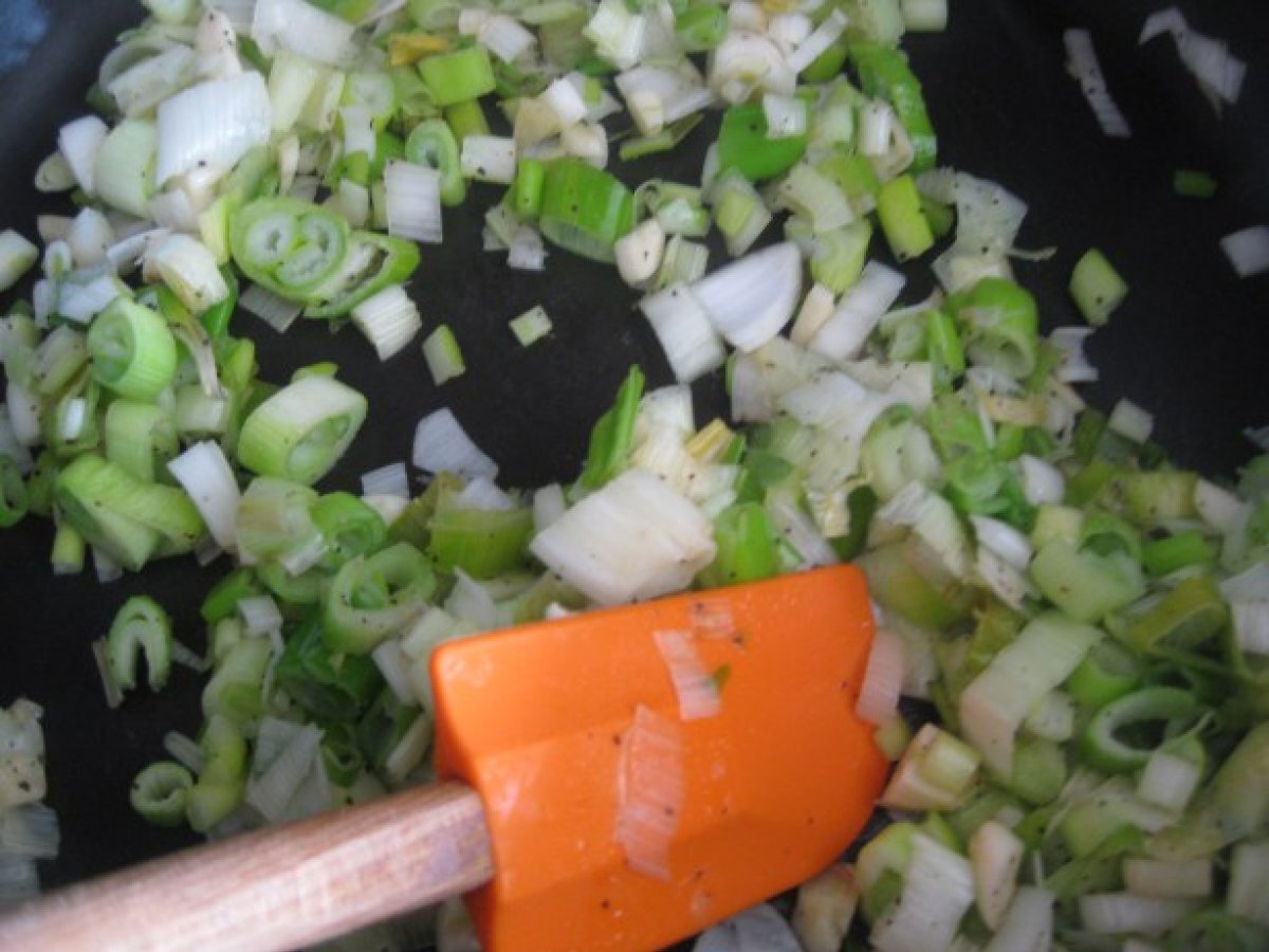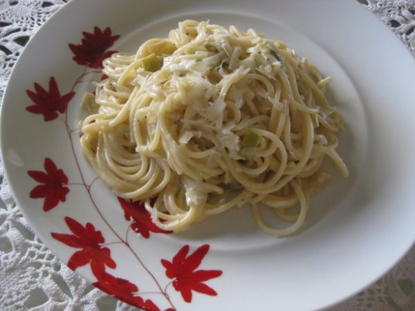 Spaghetti con puerro ancho, ajo, y crema AnteriorSiguiente PlatoFácil20 min Enviar esta receta a un amigo Imprimir esta página Preguntar al autor Publicar la foto de esta receta Ingredientes 2 2 cucharadas mantequilla sin sal 1 cucharada aceite de oliva 10 tazas de puerro ancho, cortados a lo largo y luego a lo ancho (alrededor de 6 espigas medianas, vienen siendo más o menos dos paquetes de los que empacan en el super) 10 dientes de ajo medianos, picaditos 1/2 taza vino blanco 1 tasa caldo de pollo (puede ser de lata) 12 oz de espaghetti o tu pasta de elección 1 taza de crema de leche 1/2 a 3/4 taza parmesano rallado 1/4 taza perejil picado Sal y pimienta