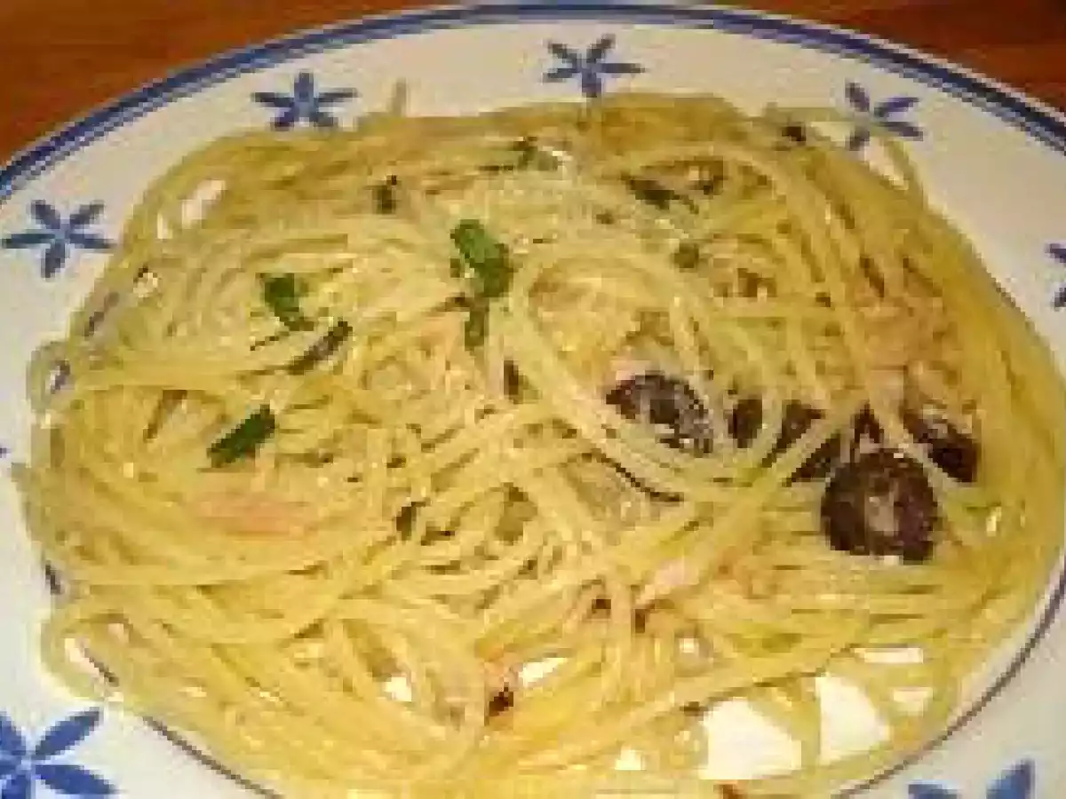 Spaghetti salmone e olive nere (espaguetis salmón y aceitunas negras) PlatoFácil30 min Enviar esta receta a un amigo Imprimir esta página Preguntar al autor Publicar la foto de esta receta Ingredientes 2 240 gr. de espaguetis, 80 gr. de salmón ahumado, 6 aceitunas negras, 1/4 de cebolla, albahaca, piñones, aceite, sal y vino blanco.