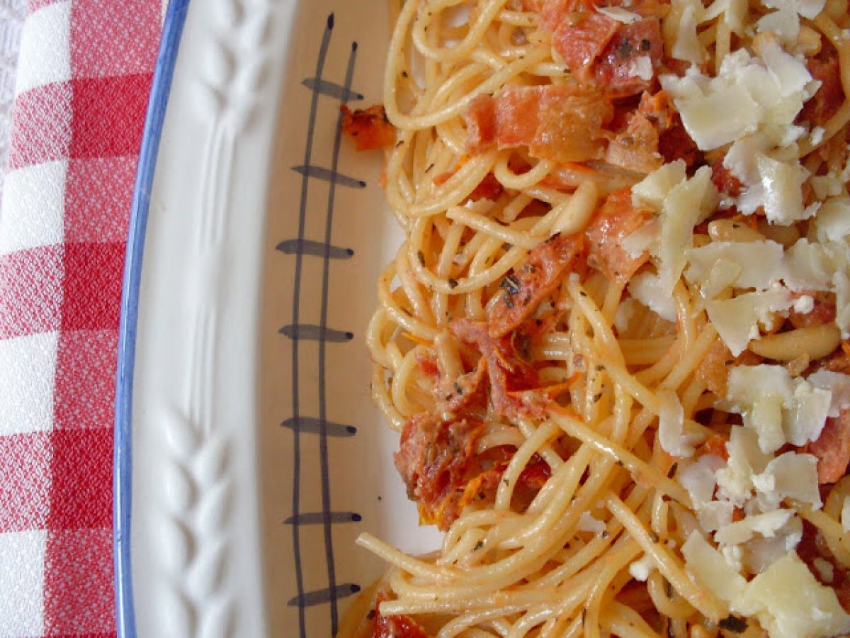 Spaghettini al pesto rosso panna AnteriorSiguiente PlatoFácil35 min Enviar esta receta a un amigo Imprimir esta página Preguntar al autor Publicar la foto de esta receta Ingredientes 3 200 g de spaghettini 50 g de tomates secos 1 brick de nata para cocinar de los pequeñitos 1 puñado de piñones 1 diente de ajo Aceite de oliva virgen extra Sal y pimienta Albahaca Queso para rallar