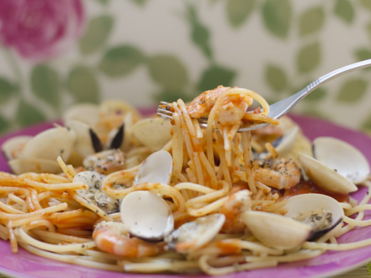 - Juntamos los spaguetti con el marisco, echamos tomate frito al gusto y espolvoreamos con un poco de albahaca.