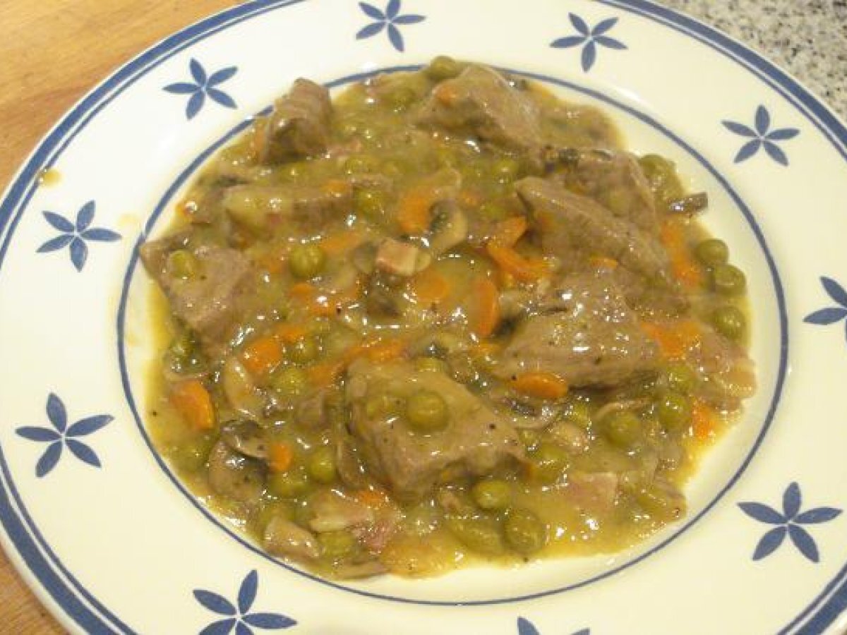 Spezzatino di manzo con funghi e piselli (guiso de ternera con setas) PlatoFácil1 h 40 m Enviar esta receta a un amigo Imprimir esta página Preguntar al autor Publicar la foto de esta receta Ingredientes 1 200 gr. de ternera para guisar, 150 gr. de setas, 70 gr. de guisantes, 2 lonchas de panceta, 1 zanahoria, 1/3 de cebolla, caldo, romero, laurel, vino blanco, aceite, pimienta negra, sal y harina.
