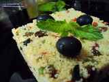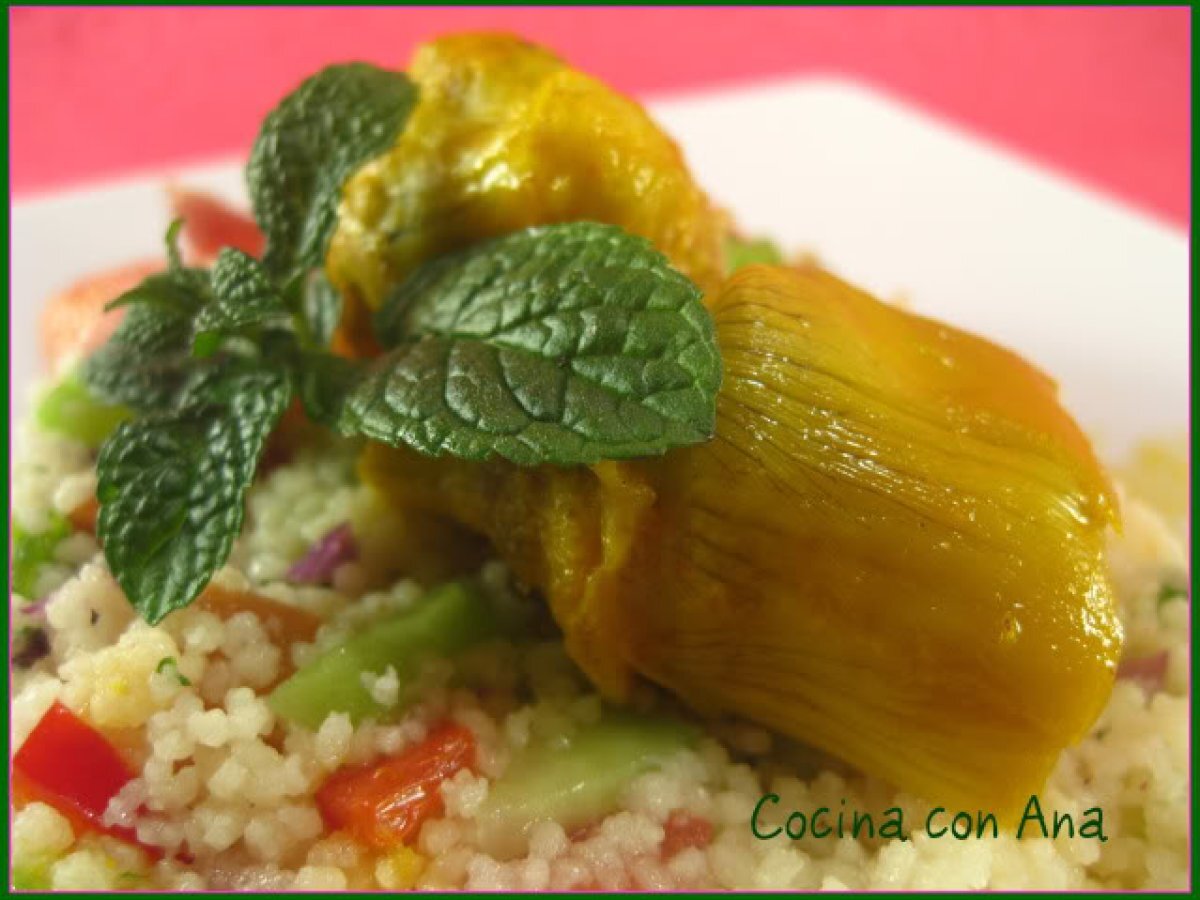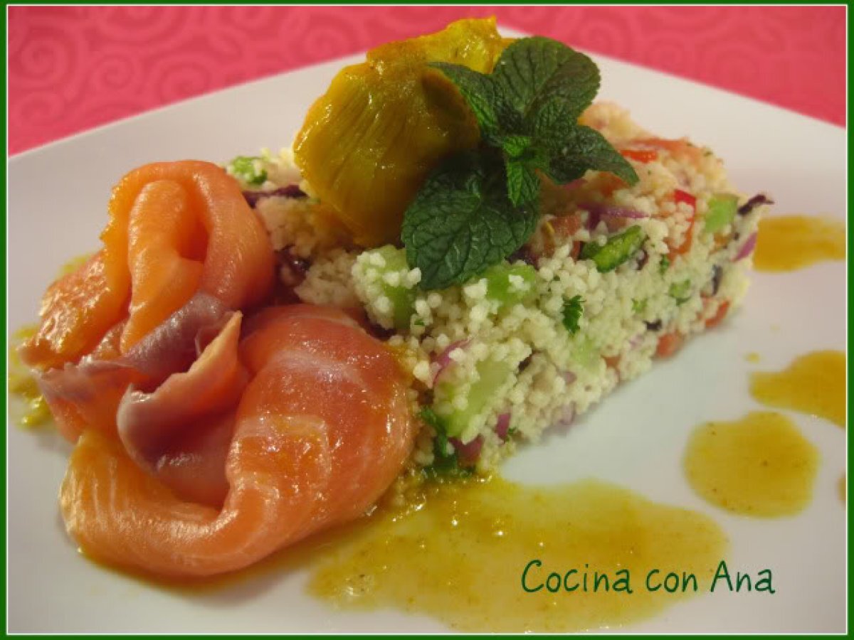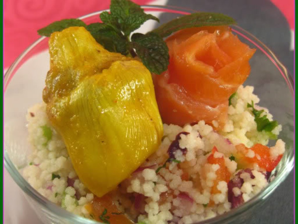 Tabule con flor de salmon y alcachofas confitadas AnteriorSiguiente PlatoMedio40 min Enviar esta receta a un amigo Imprimir esta página Preguntar al autor Publicar la foto de esta receta Ingredientes 2 60 g por persona de salmón ahumado para hacer las flores PARA EL TABULÉ : 100 g de cous-cous precocido 150 g de agua sal 2 cucharadas de aceite de oliva un trozo de pepino 1/2 tomate un trozo de pimiento rojo un trozo de pimiento verde 10 aceitunas negras el zumo de 1/2 limón 1/2 cebolla morada un ramito de perejil fresco un tallito de menta fresca ALCACHOFAS CONFITADAS CON ESPECIAS : una lata de corazones de alcachofa el zumo de dos naranjas 2 cucharadas de azúcar moreno 1/2 cucharadita de "ras el hanout" son una mezcla de especias que ya venden hecha, y lleva (comino, cardamomo, jenjibre, cúrcuma, cilantro, pimienta, pimentón, clavos, nuez moscada, canela, chile)