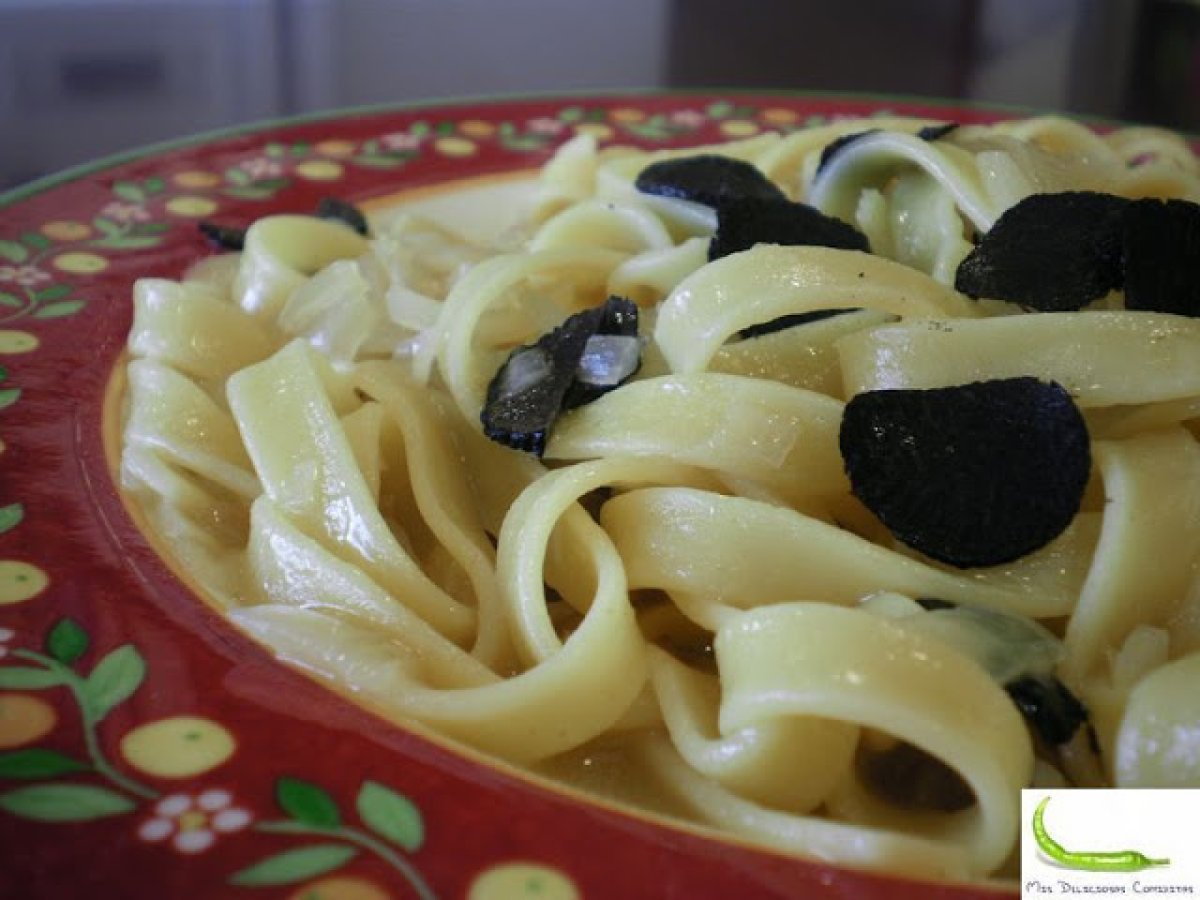 Tagliatelle al tartufo nero AnteriorSiguiente PlatoFácil15 min Enviar esta receta a un amigo Imprimir esta página Preguntar al autor Publicar la foto de esta receta Ingredientes 2 200 g de tagliatelle de huevo. 2 ó 3 trufas, según tamaño. Una cebolla. Un vaso de vino blanco. Dos vaso de agua. Dos cucharadas de mantequilla. Un chorro de aceite de oliva v.e.