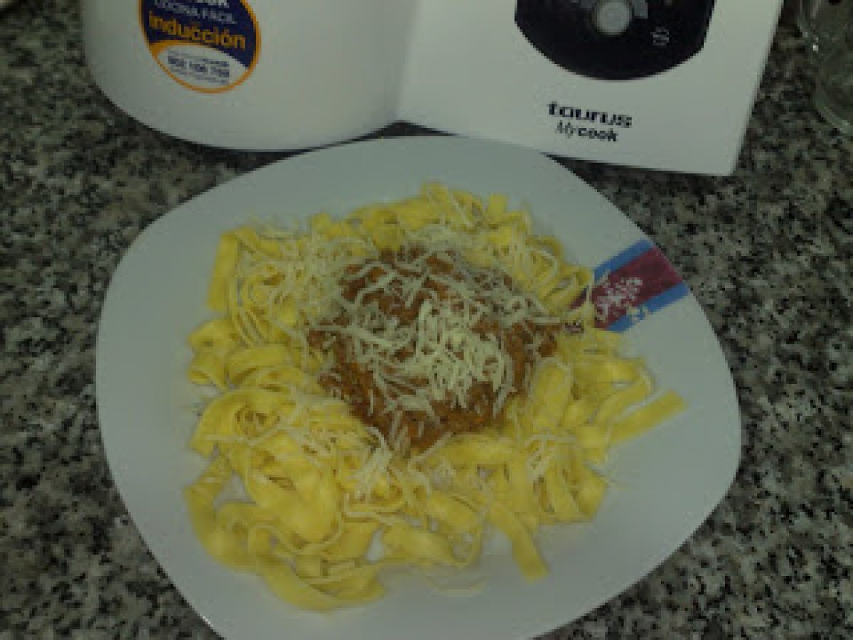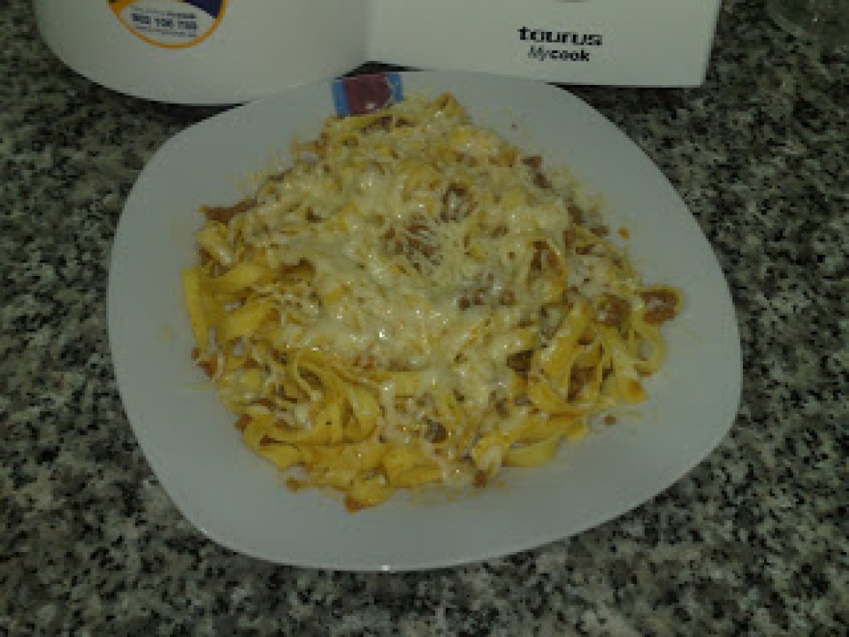 Tagliatelle con carne de ternera( espaguetis de pasta fresca) AnteriorSiguiente PlatoFácil25 min Enviar esta receta a un amigo Imprimir esta página Preguntar al autor Publicar la foto de esta receta Un ingreso fácil a prepararse. Un placer. Ingredientes 4 Para la salsa : 300 g de carne picada de ternera 150 g de cebolla 150 g de zanahoria 320 g de tomate natural triturado 50 ml de vino blanco 50 g de aceite de oliva sal pimienta 1 cucharadita de hiervas provenzales Para la pasta : 1 paquete de tagliatelle (pasta fresca) sal aceite un chorito solo 1 hoja de laurel 1.500 ml de agua caliente