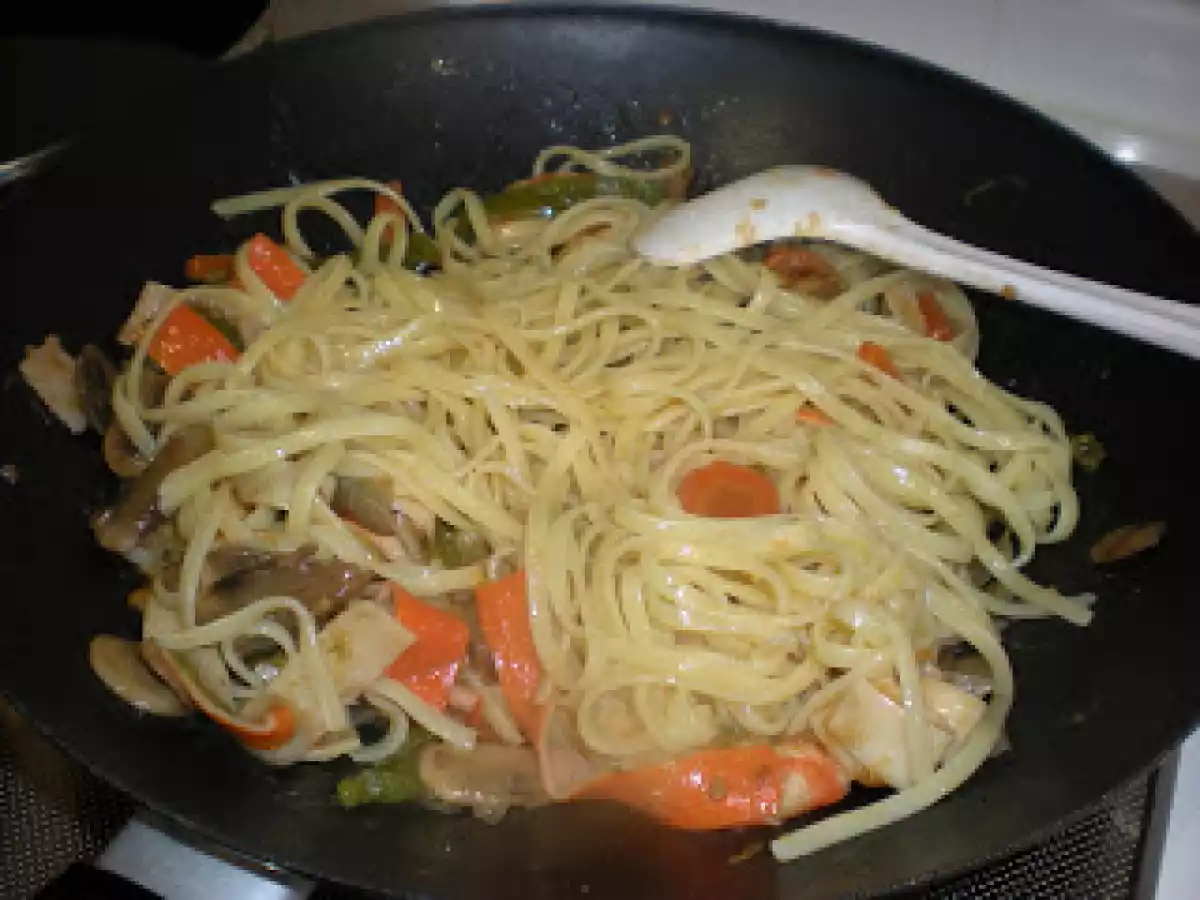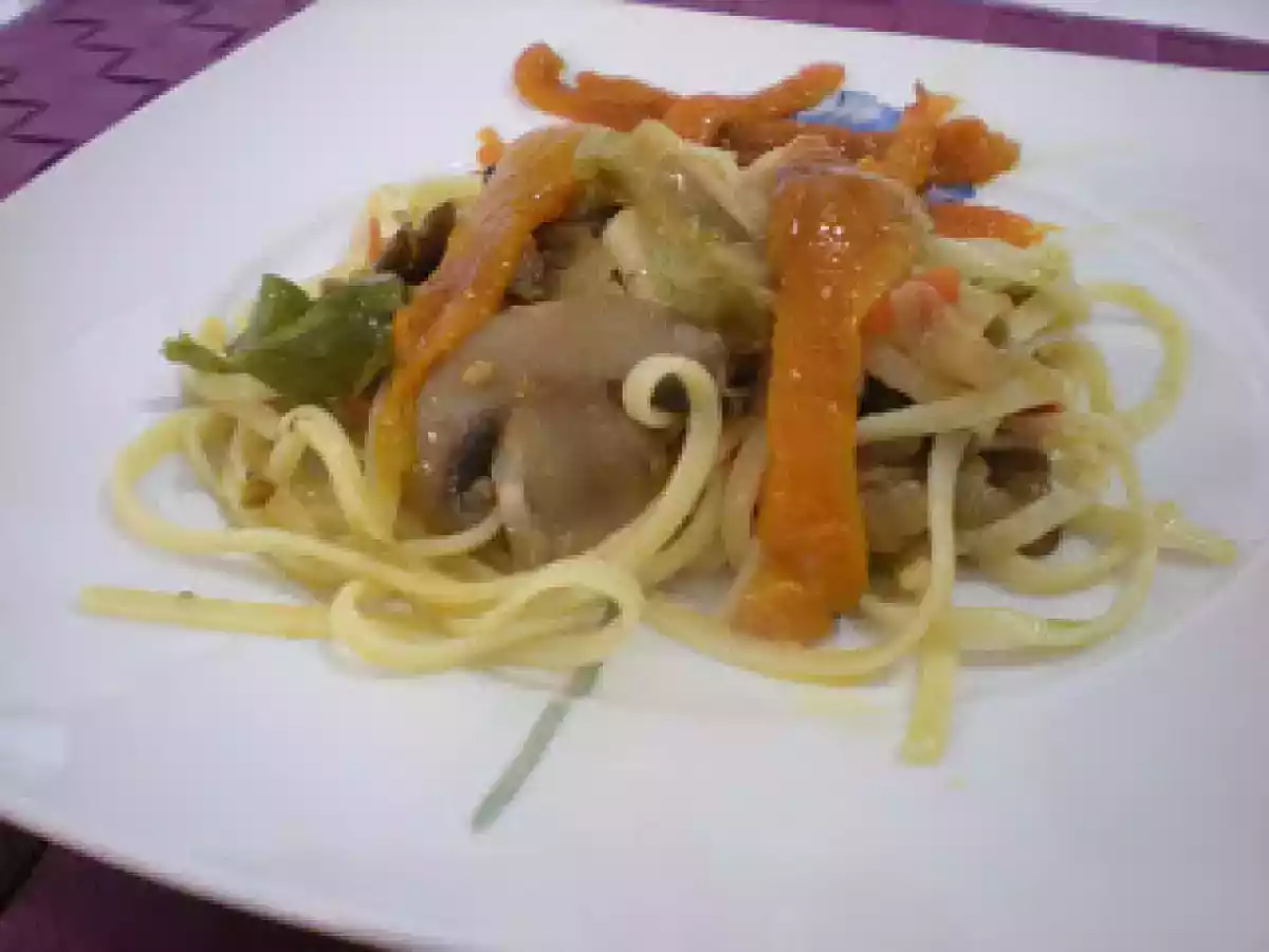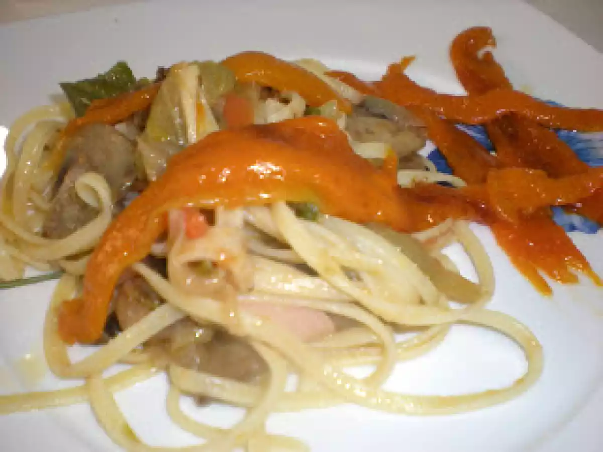 Tallarines con pimientos rojos asados AnteriorSiguiente PlatoFácil25 min775 Kcal Enviar esta receta a un amigo Imprimir esta página Preguntar al autor Publicar la foto de esta receta Ingredientes 2 2 pimientos rojos para asar 150 g de tallarines al huevo 250 g de champiñones 1 pimiento verde troceado 2 zanahoria cortada en juliana 1 cebolla cortada en juliana 2 tomates medianos cortados en dados 3 dientes de ajos partidos en láminas 5 cucharas de aceite oliva suave 1 toque de pimienta negra 1 toque de orégano 1 toque de sal al gusto 1 copa de brandy Costo estimado: 5.8Euros€ (2.9€/porción)