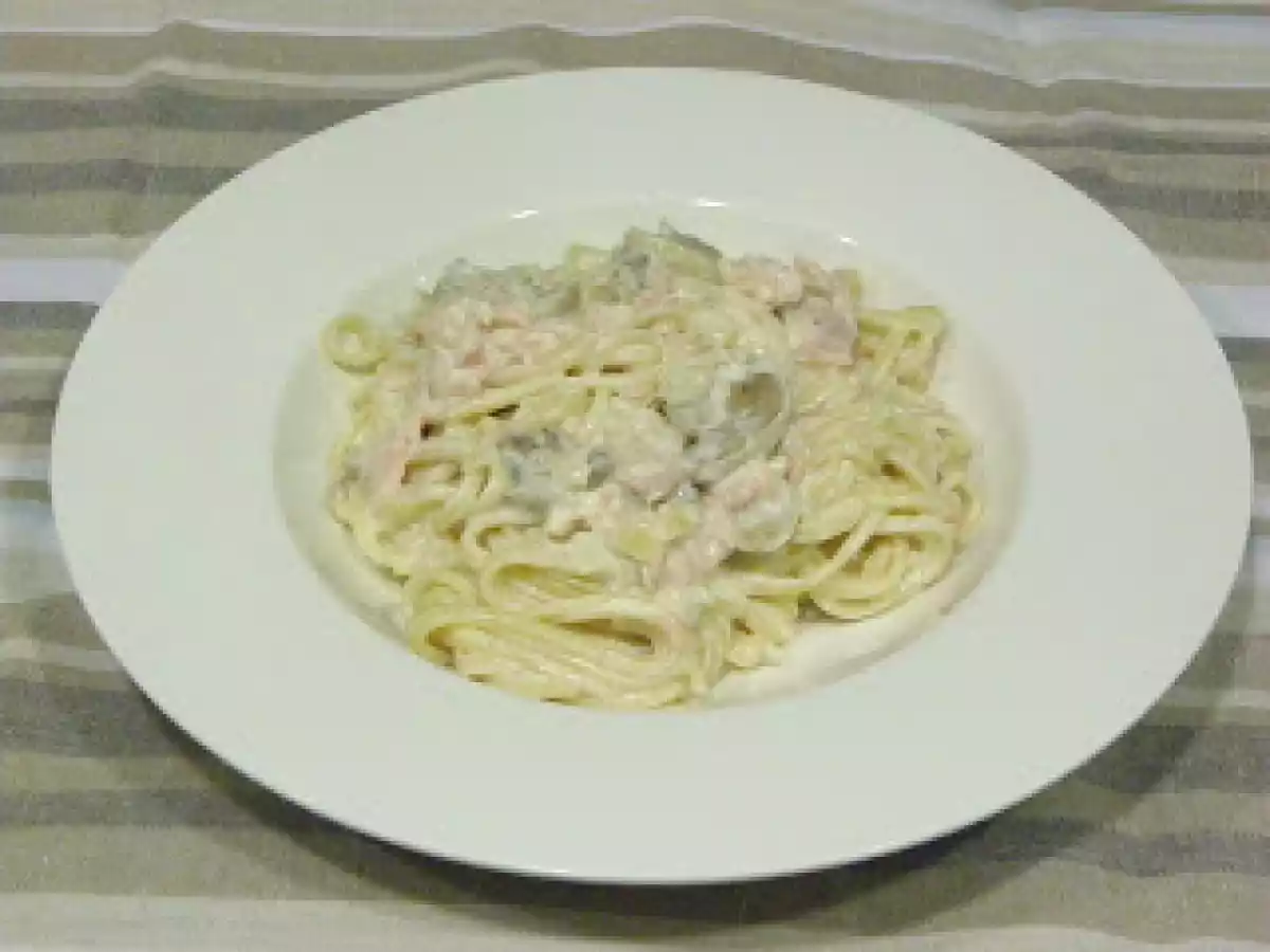 Tallarines con salmón ahumado y champiñones PlatoFácil20 min Enviar esta receta a un amigo Imprimir esta página Preguntar al autor Publicar la foto de esta receta Ingredientes 2 200 g de pasta 150 g de salmón ahumado1 lata pequeña de champiñones 200 ml de nata líquida 1 cebolla pequeña 2 cucharaditas de queso rallado Aceite pimienta