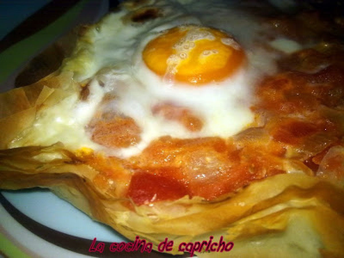 Tarta de pasta philo rellena de tomate y huevo PlatoFácil10 min340 Kcal Enviar esta receta a un amigo Imprimir esta página Preguntar al autor Publicar la foto de esta receta Ingredientes 4 12 láminas de masa filo Tomate frito en casa 4 huevos Mantequilla para pintar la pasta Costo estimado: 2.09Euros€ (0.52€/porción)