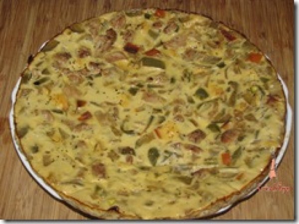 Tarta salada de verduras y pollo PlatoFácil50 min1543 Kcal Enviar esta receta a un amigo Imprimir esta página Preguntar al autor Publicar la foto de esta receta Ingredientes 2 1 Calabacín Un poquito de aceite oliva virgen extra Una cebolla Un pimiento Sal 3 huevos 1 vaso de leche desnatada 3 quesitos light 2 filetes de pollo asados ( que me sobraron del almuerzo)