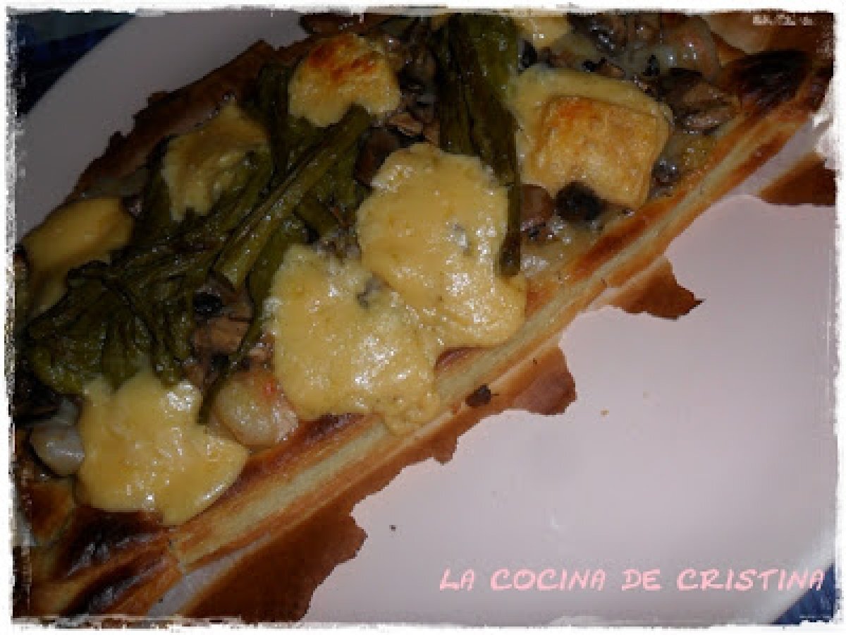Tartaletas de champiñones y gambas con queso old amsterdan vota ahora AnteriorSiguiente PlatoFácil1 h 5 m420 Kcal Enviar esta receta a un amigo Imprimir esta página Preguntar al autor Publicar la foto de esta receta Ingredientes 4 1 Placa de hojaldre media cebolla 1 puerro medio calabacin una bandeja de champiñones laminados gambas peladas y crudas espárragos trigueros 1 cucharada de harina 1 vaso de caldo de pescado sal y pimienta al gusto queso