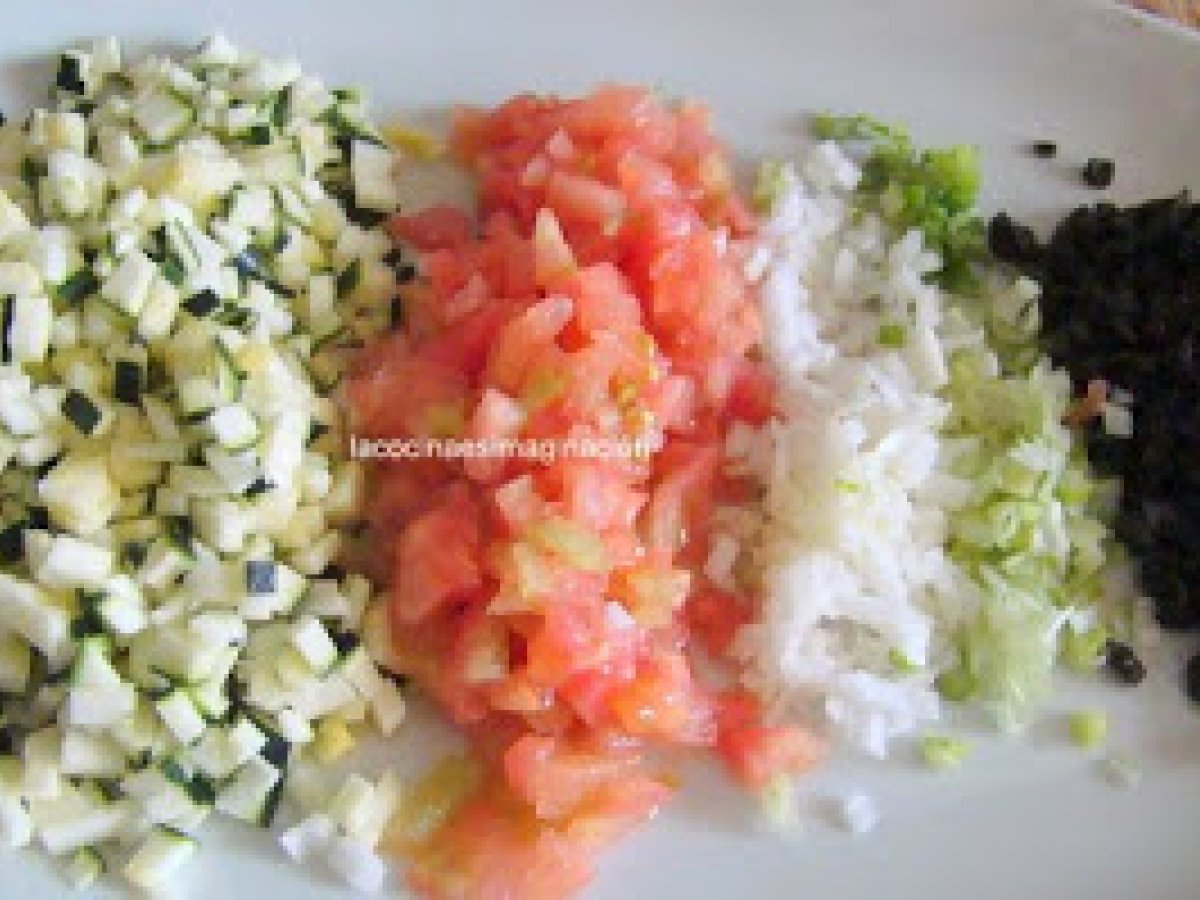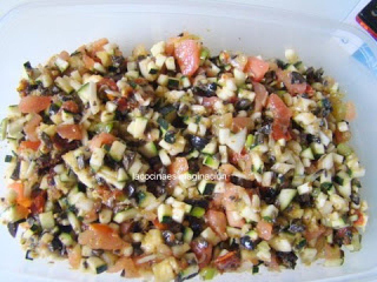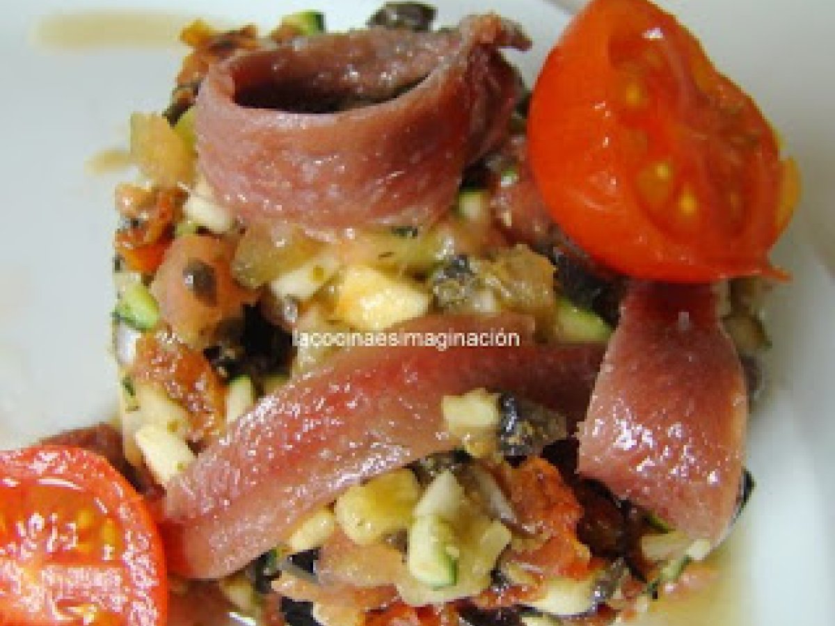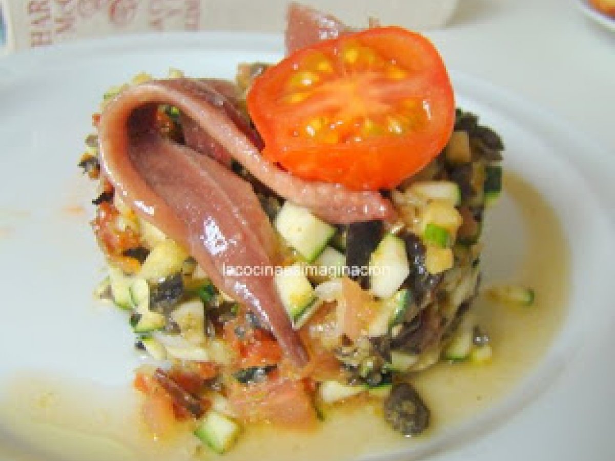 Tartar de calabacín AnteriorSiguiente PlatoFácil30 min242 Kcal Enviar esta receta a un amigo Imprimir esta página Preguntar al autor Publicar la foto de esta receta Ingredientes 2 1 calabacín pequeño 1 tomate mediano 5 trozos de tomate seco al horno 50 g de aceitunas negras deshuesadas 2 cucharadas de pesto(en esta ocasión del que venden hecho) 1/2 cebolleta 1 cucharada de cebollino picado 1 chorrito aceite de oliva virgen extra Sal y pimienta unas anchoas unos tomates cherry Costo estimado: 2.95Euros€ (1.47€/porción)