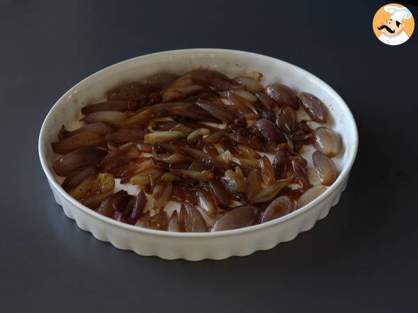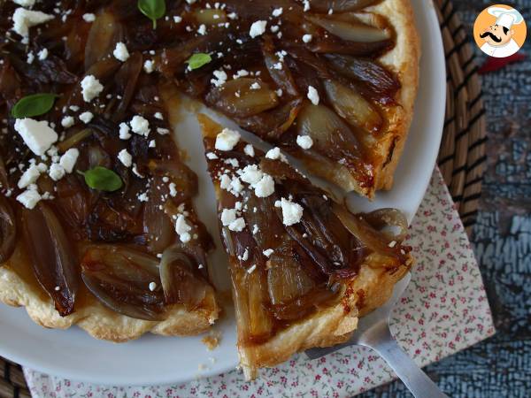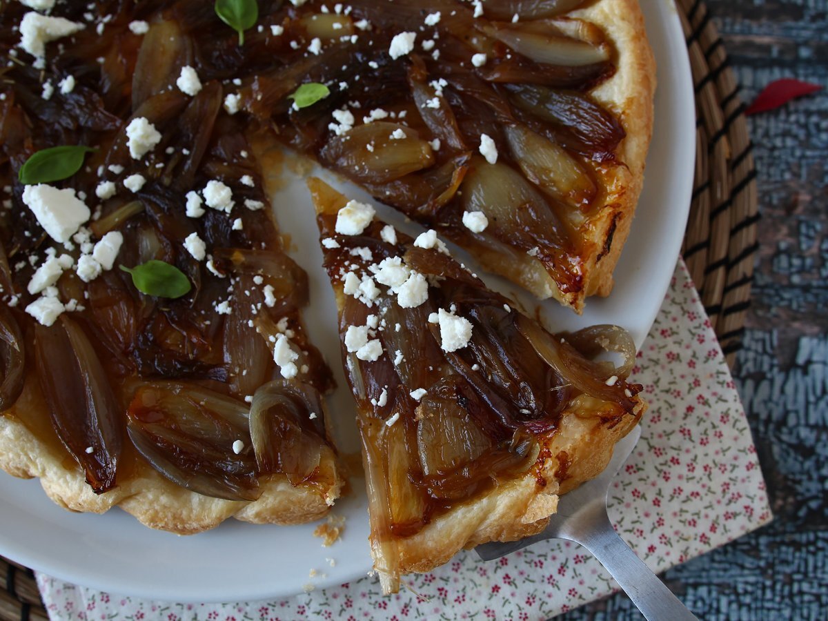 Tarta tatin con chalotas caramelizadas y queso feta