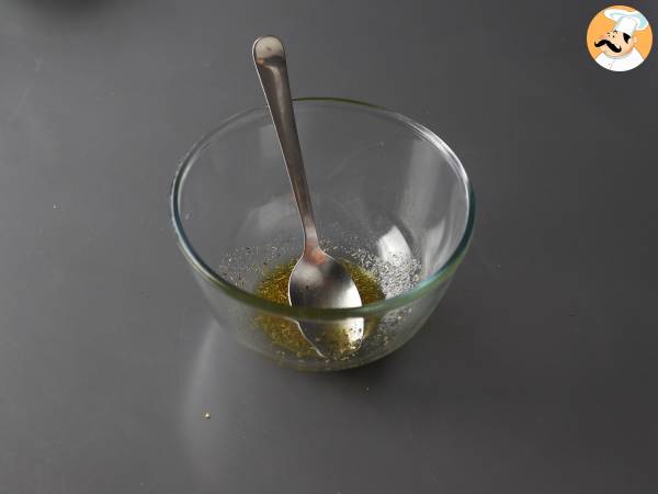 En un bol, mezclar: el aceite de oliva, la sal, la pimienta, el ajo en polvo y las hierbas de Provenza.