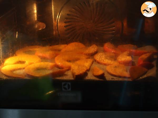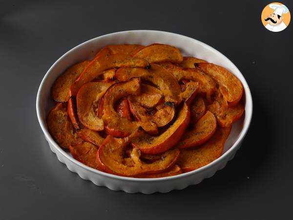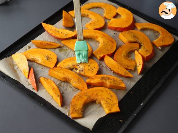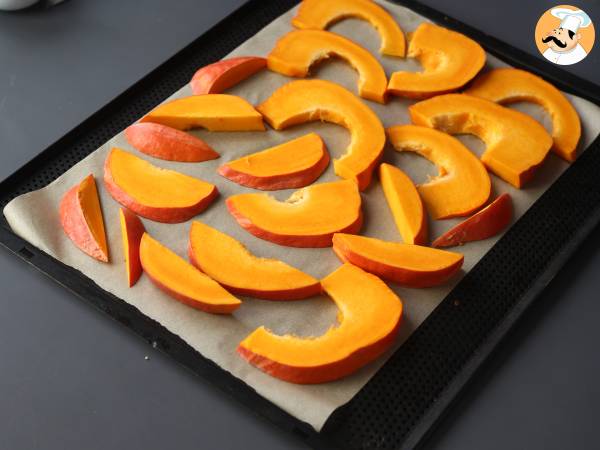 Colocar las rodajas de calabaza en una bandeja de horno en la que habremos puesto papel de horno.