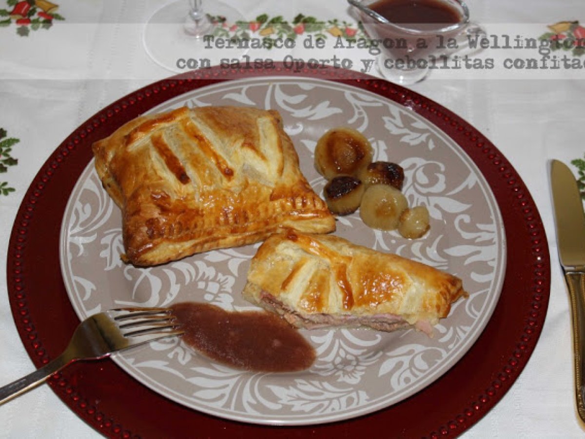 Ternasco de aragon a la wellington con salsa oporto y .... vota ahora PlatoFácil1 hora6956 Kcal Enviar esta receta a un amigo Imprimir esta página Preguntar al autor Publicar la foto de esta receta Ingredientes 1 1 plancha de hojaldre 8 filetes de jamón york foie de pato 4 chuletas de Ternasco de Aragón 1 cebolla 500 ml de caldo de carne 200 ml de Oporto 20 cebollitas enanas 300 ml de aceite de oliva