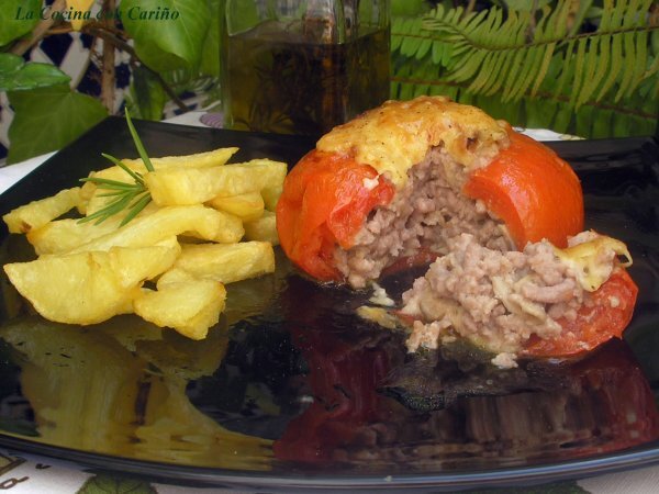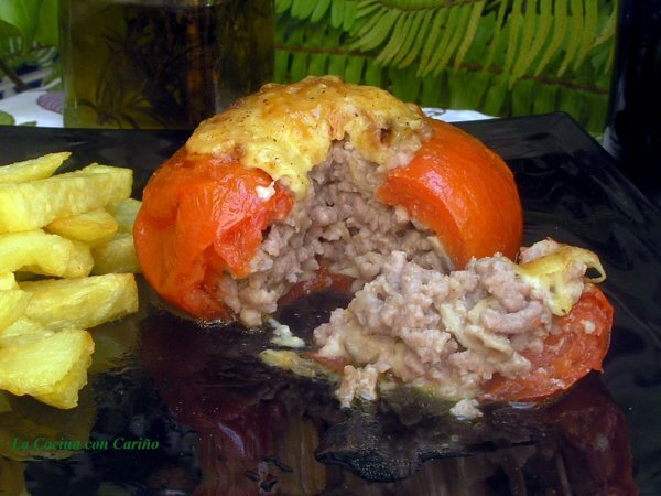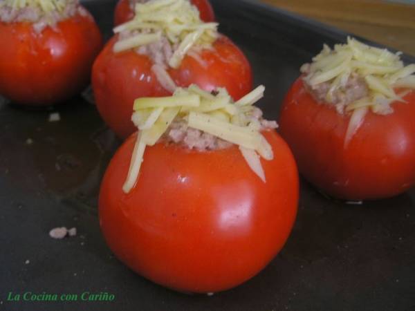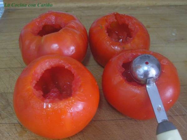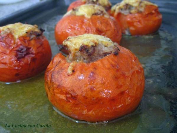 Llevo un par de meses buscando en la red, recetas de tomates rellenos, y tras haber encontrado varias, de las cuales he tomado mis correspondientes notas, faltaba el encontrar el tomate perfecto. Pues bien, ayer, cuando fui a Manolo, mi frutero, encontré los tomates que andaba buscando. Rojo y enteros, pero maduras a la vez, con el tamaño adecuado y de piel firme, para aguantar el horneado, pero los suficientemente fina como para comerla. Lo dicho, perfectos. Pues nada, ahí va esta receta.
