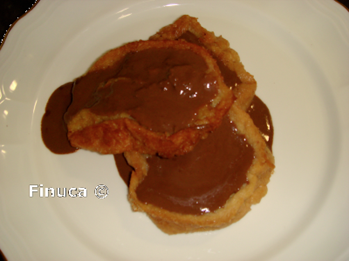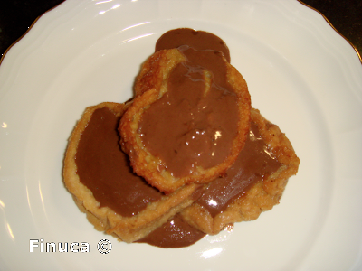 Torrijas con chocolate "navidad" AnteriorSiguiente PlatoFácil30 min1143 Kcal Enviar esta receta a un amigo Imprimir esta página Preguntar al autor Publicar la foto de esta receta Ingredientes 2 1 pan especial de torrijas o un pan blanco. Siempre del día anterior. 1 litro de leche desnatada 1 palo de canela 200 g de azúcar moreno la piel de media naranja (evitar la parte blanca) la piel de medio limón (evitar la parte blanca) aceite de oliva 3 huevos 1/2 litro de leche desnatada 1/2 tableta de chocolate negro extrafino Nestlé. Costo estimado: 4.21Euros€ (2.11€/porción)