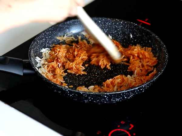 Vierte el aceite neutro en una sartén caliente. Añade el arroz cocido, remueve ligeramente y deja que se saltee durante unos minutos.