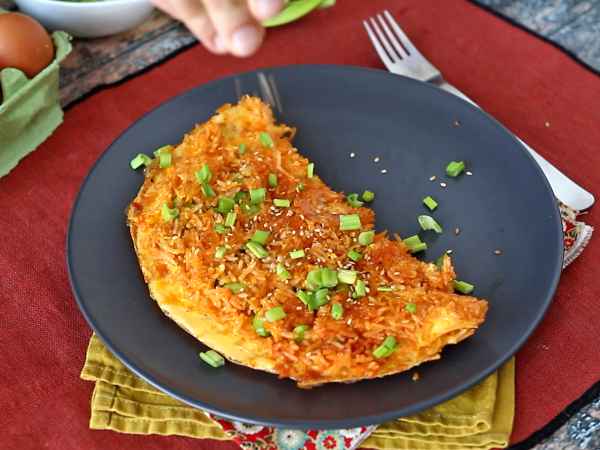 Esta tortilla es una forma deliciosa y original de aprovechar arroz cocido del día anterior. La base combina arroz basmati salteado en aceite neutro, enriquecido con una pasta de pimiento fermentado coreano (gochujang) y mantequilla para crear una base llena de sabor y matices. Encima se vierten los huevos batidos y se dejan cuajar con la sartén tapada, para que queden jugosos por dentro y dorados por fuera. Para terminar, se añaden unos granos de soja (edamame), un poco de cebolleta picada y unas semillas de sésamo tostado (o ajonjolí). ¿El resultado? Una tortilla con alma asiática, que combina el dorado del arroz crujiente con la suavidad del huevo y una mezcla de sabores que no se olvida.