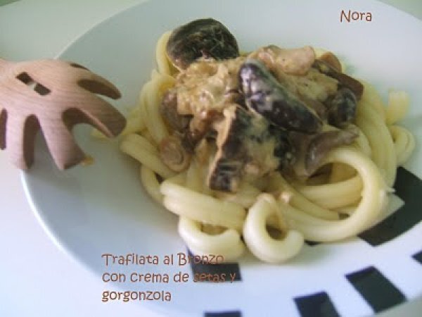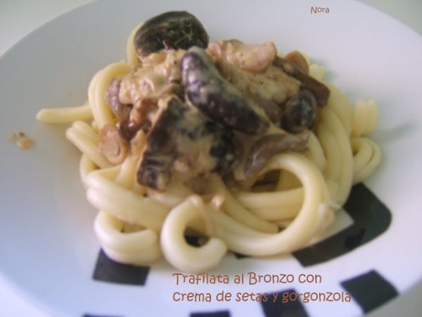 Trafilata al bronzo (pasta de sémola de grano duro) con crema de setas y gorgonzola AnteriorSiguiente PlatoFácil19 min Enviar esta receta a un amigo Imprimir esta página Preguntar al autor Publicar la foto de esta receta Ingredientes 2 350 g de Trafilata al Bronzo (vale cualquier pasta) 250 g de setas variadas (de bote) 250 ml de leche evaporada 50 g de gorgonzola (opcional) 1 diente de ajo 1 cebolla 1/2 vaso de vino blanco Aceite de oliva Sal Pimienta Nuez moscada Parmesano rallado