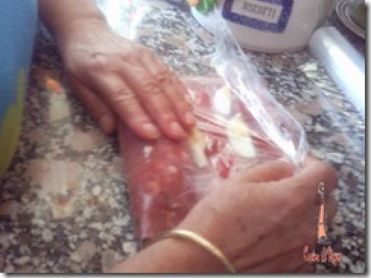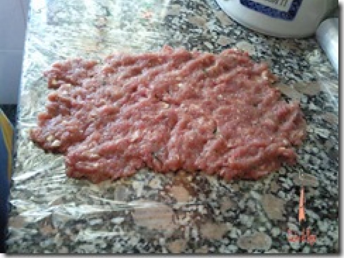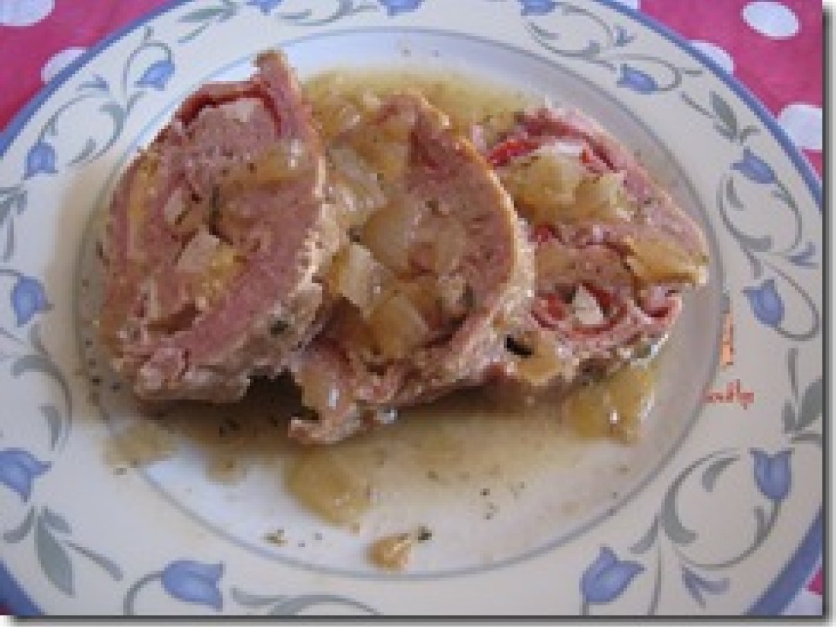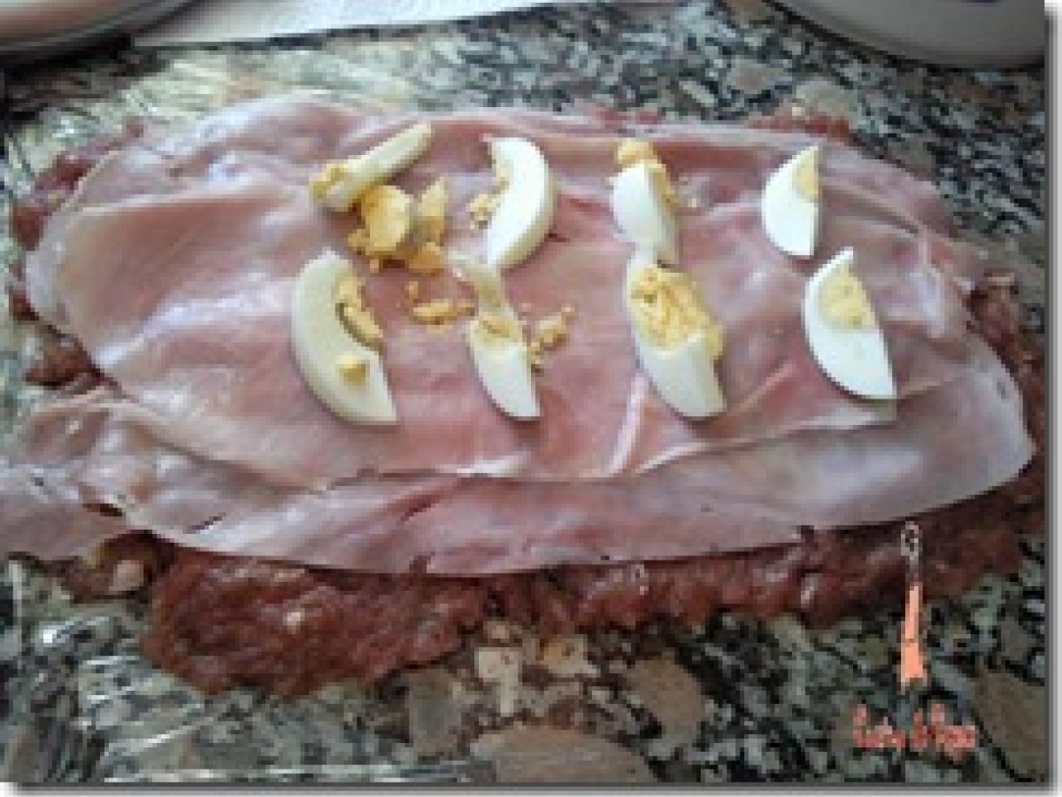 Tronco de carne relleno vota ahora AnteriorSiguiente PlatoFácil30 min656 Kcal Enviar esta receta a un amigo Imprimir esta página Preguntar al autor Publicar la foto de esta receta Ingredientes 4 1 kg de carne picada (cerdo y ternera) 1 lata pimientos morrones 150 g de jamón cocido 2 huevos duros Ajo picado Perejil Pimienta 1 huevo Para la salsa: 1 cebolla 1 vaso de cava 1/2 vasito de agua Romero Tomillo Costo estimado: 15.04Euros€ (3.76€/porción)
